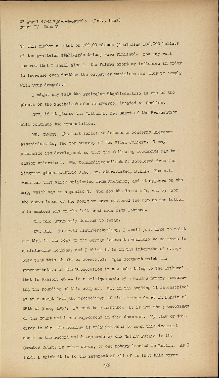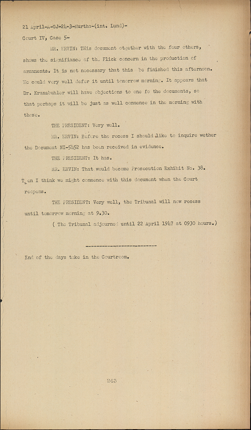 MR. ERVIN: THis document otgether with the four others, shows the signifiance of the Flick concern in the production of armaments. It is not necessary that this be finished this afternoon. We could very well defer it until tomorrow morning. It appears that Dr. Kranzbuhler will have objections to one fo the documents, so that perhaps it will be just as well commence in the morning with these.