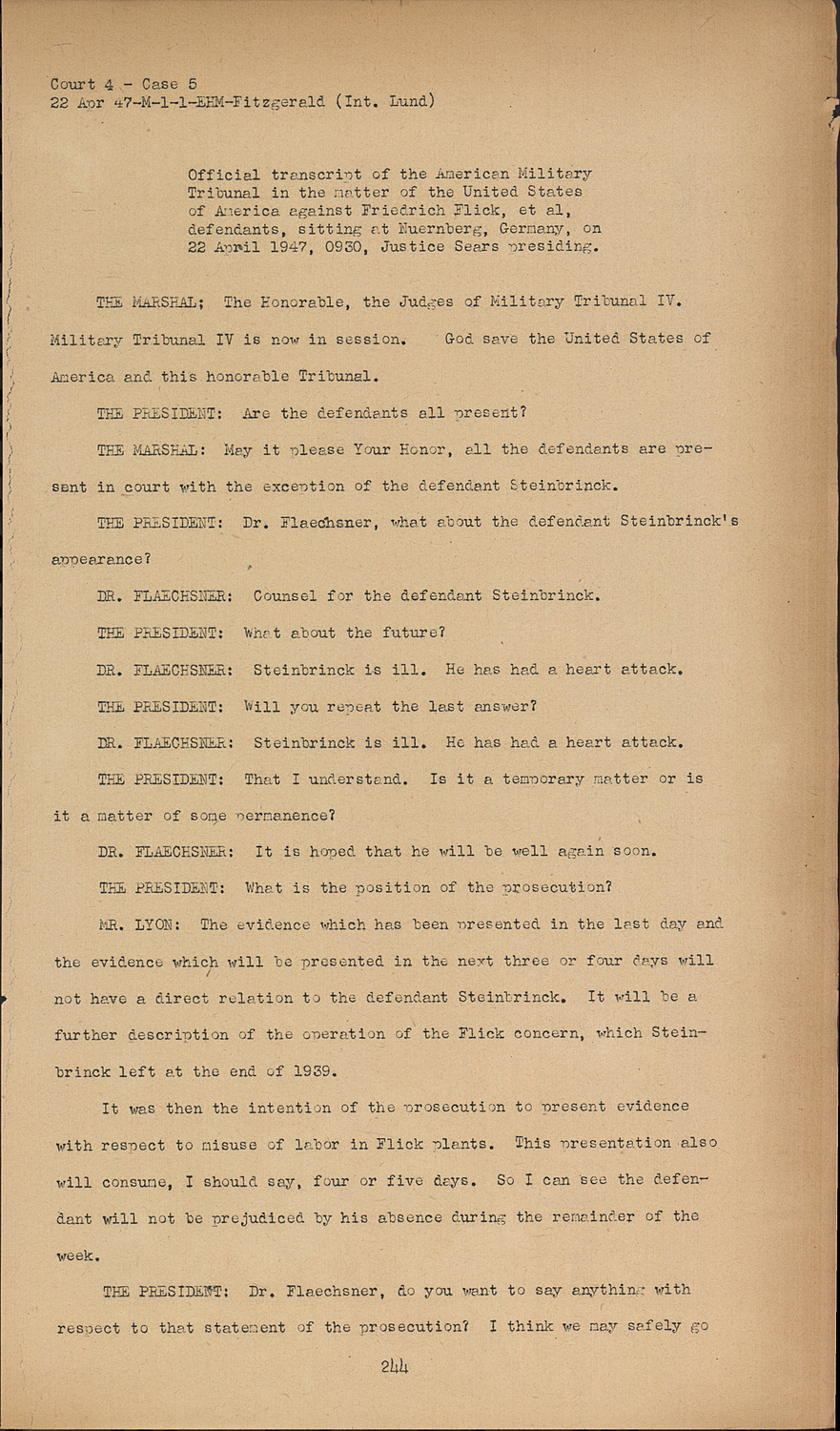 THE PRESIDENT:Dr. Flaechsner, do you want to say anything with respect to that statement of the prosecution? I think we may safely go Court 4 - Case 5 on without any injury to the interests of Mr. Steinbrinck.