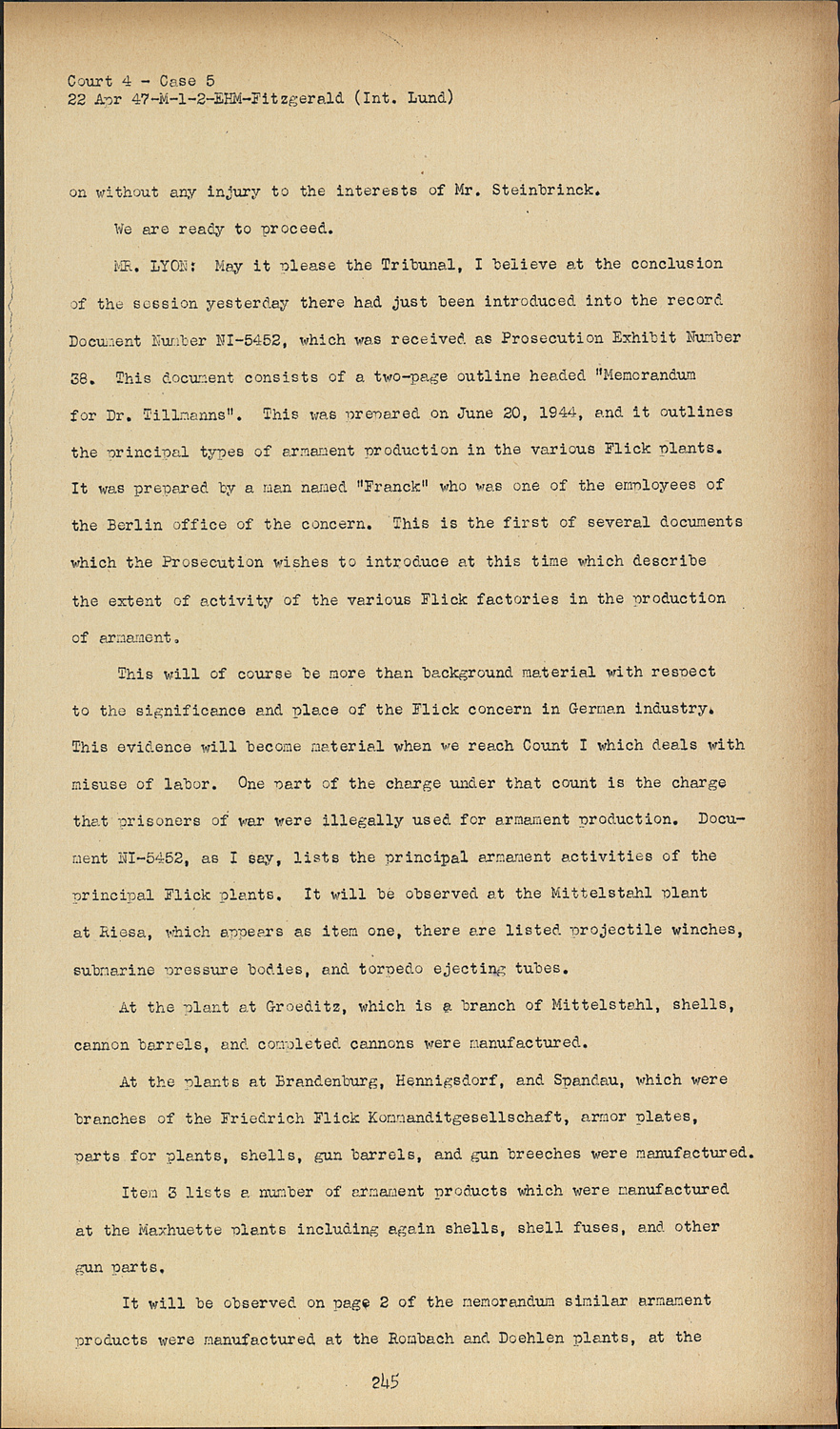 MR. LYON:May it please the Tribunal, I believe at the conclusion of the session yesterday there had just been introduced into the record Document Number NI-5452, which was received as Prosecution Exhibit Number 38. This document consists of a two-page outline headed "Memorandum for Dr. Tillmanns". This was prepared on June 20, 1944, and it outlines the principal types of armament production in the various Flick plants. It was prepared by a man named "Franck" who was one of the employees of the Berlin office of the concern. This is the first of several documents which the Prosecution wishes to introduce at this time which describe the extent of activity of the various Flick factories in the production of armament.