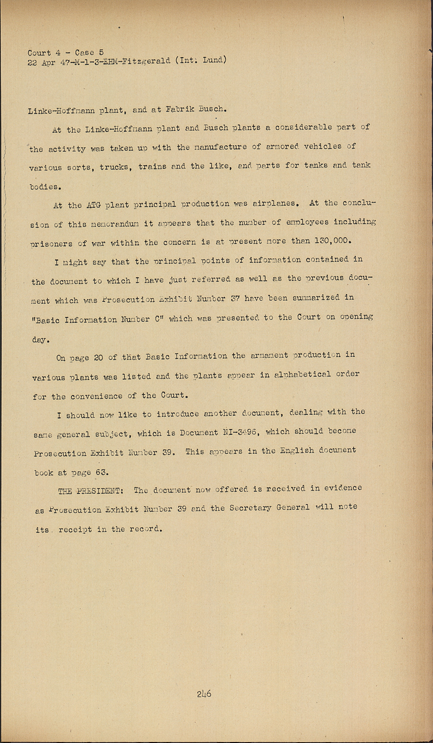 THE PRESIDENT:The document now offered is received in evidence as Prosecution Exhibit Number 39 and the Secretary General will note its receipt in the record.