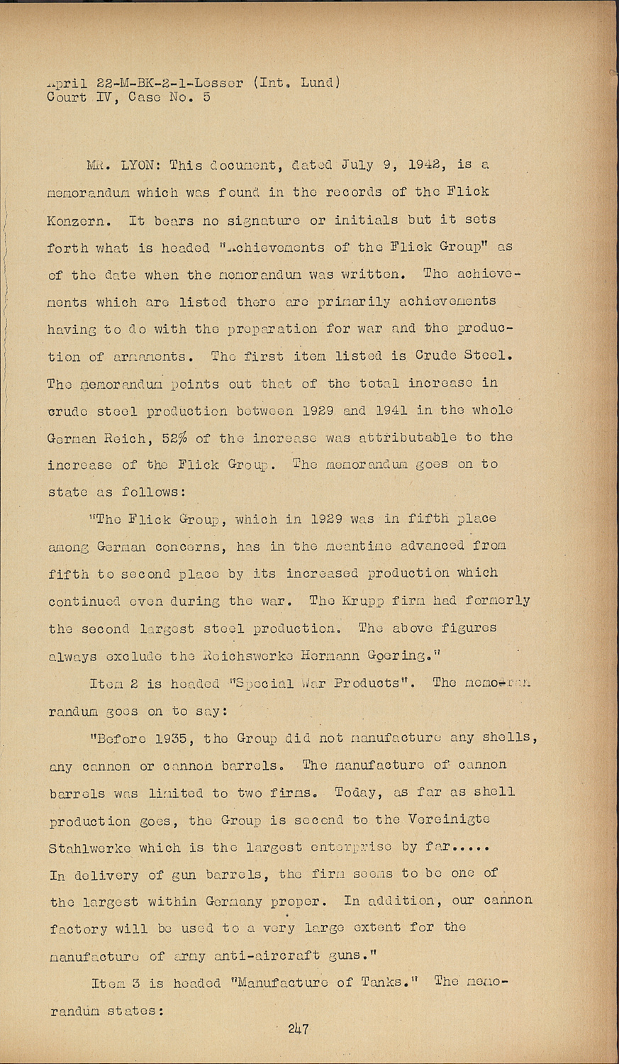 MR. LYON:This document, dated July 9, 1942, is a memorandum which was found in the records of the Flick Konzern. It bears no signature or initials but it sets forth what is headed "Achievements the Flick Group" as of the date when the memorandum was written. The achievements which are listed there are primarily achievements having to do with the preparation for war and the production of armaments. The first item listed is Crude Steel. The memorandum points out that of the total increase in crude steel production between 1929 and 1941 in the whole German Reich, 52% of the increase was attributable to the increase of the Flick Group. The memorandum goes on to state as follows: