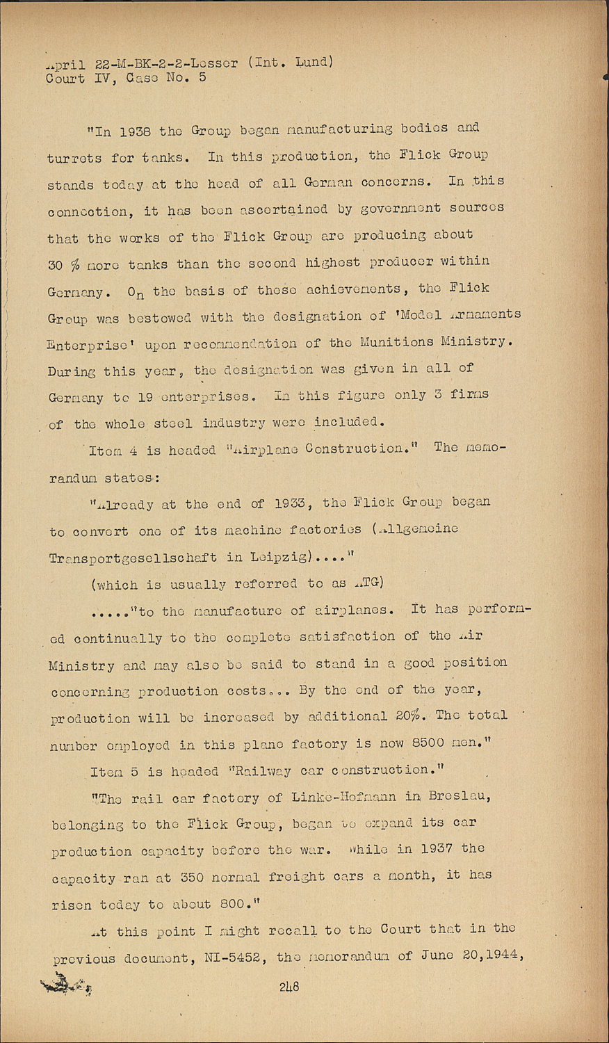 At this point I might recall to the Court that in the previous document, NI-5452, the memorandum of June 20,1944, it was stated that among the products of Linke-Hofmann were tank bodies, armored trains, freight cars, and other special orders.