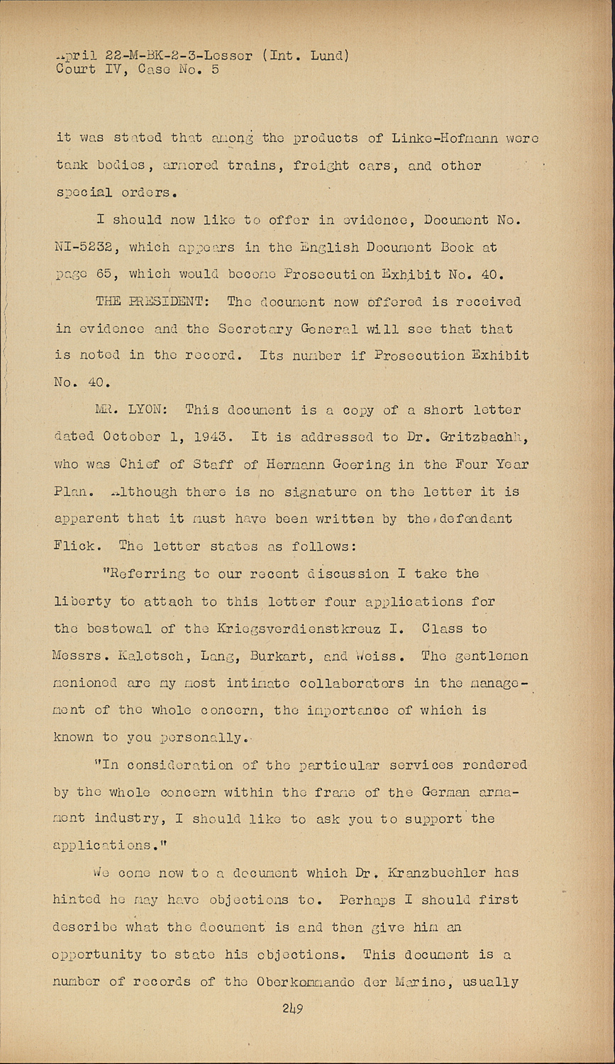 I should now like to offer in evidence, Document No. NI-5232, which appears in the English Document Book at page 65, which would become Prosecution Exhibit No. 40.