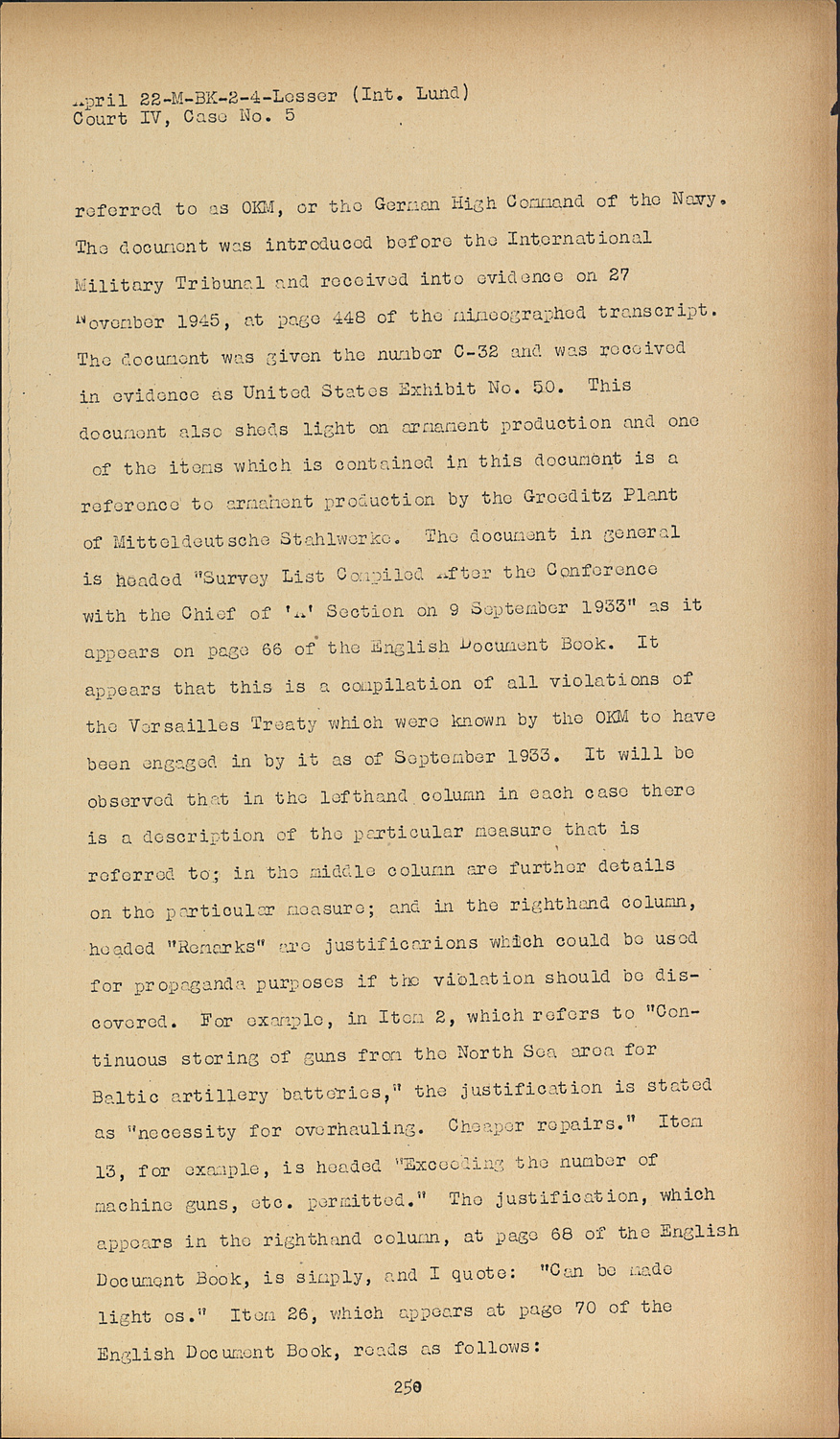 The document was introduced before the International Military Tribunal and received into evidence on 27 November 1945, at page 448 of the mimeographed transcript. The document was given the number C-32 and was received in evidence as United States Exhibit No. 50. This document also sheds light on armament production and one of the items which is contained in this document is a reference to armament production by the Groeditz Plant of Mitteldeutsche Stahlwerke.