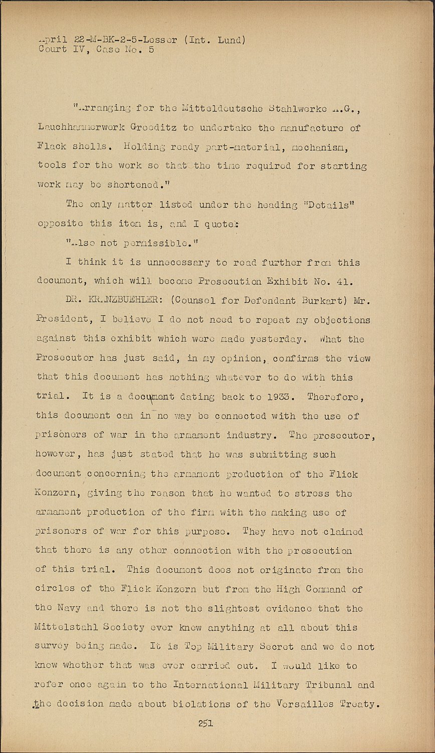 DR.KRANZBUEHLER: (Counsel for Defendant Burkart) Mr. President, I believe I do not need to repeat my objections against this exhibit which were made yesterday. What the Prosecutor has just said, in my opinion, confirms the view that this document has nothing whatever to do with this trial. It is a document dating back to 1933. Therefore, this document can in no way be connected with the use of prisoners of war in the armament industry. The prosecutor, however, has just stated that he was submitting such document concerning the armament production of the Flick Konzern, giving the reason that he wanted to stress the armament production of the firm with the making use of prisoners of war for this purpose. They have not claimed that there is any other connection with the prosecution of this trial. This document does not originate from the circles of the Flick Konzern but from the High Command of the Navy and there is not the slightest evidence that the Mittelstahl Society ever knew anything at all about this survey being made. It is Top Military Secret and we do not know whether that was ever carried out. I would like to refer once again to the International Military Tribunal and the decision made about biolations of the Versailles Treaty.