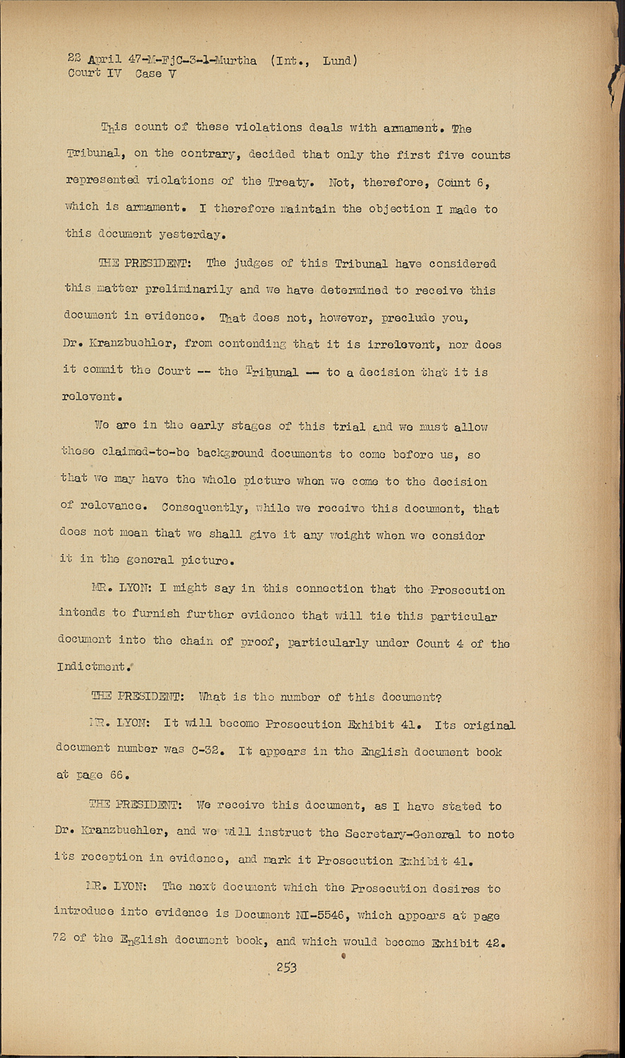 THE PRESIDENT:We receive this document, as I have stated to Dr. Kranzbuehler, and we will instruct the Secretary-General to note its reception in evidence, and mark it Prosecution Exhibit 41.