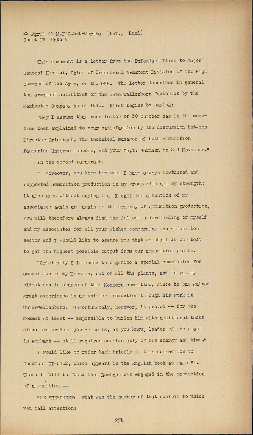 I would like to refer back briefly in this connection to Document NI-5452, which appears in the English book at page 61. There it will be found that Rombach was engaged in the production of ammunition -
