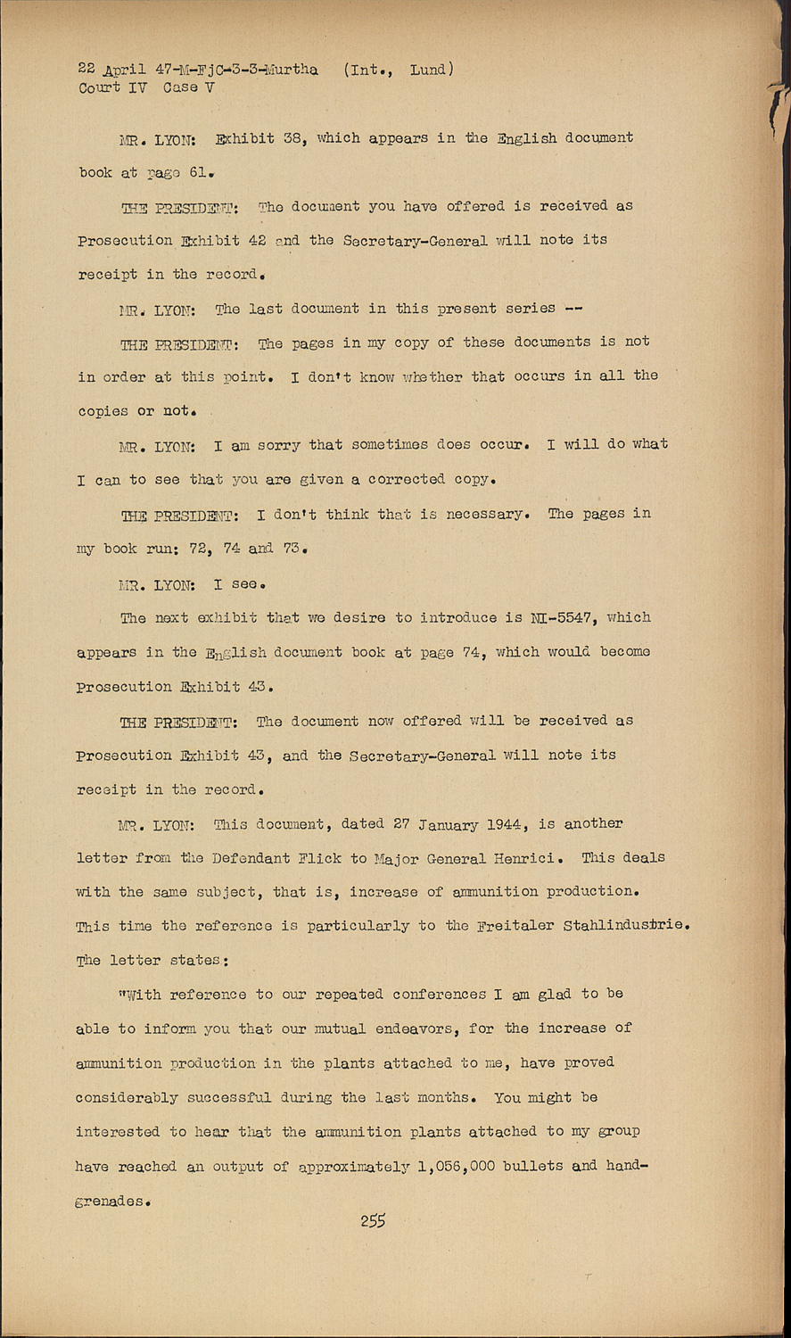THE PRESIDENT:The document now offered will be received as Prosecution Exhibit 43, and the Secretary-General will note its receipt in the record.