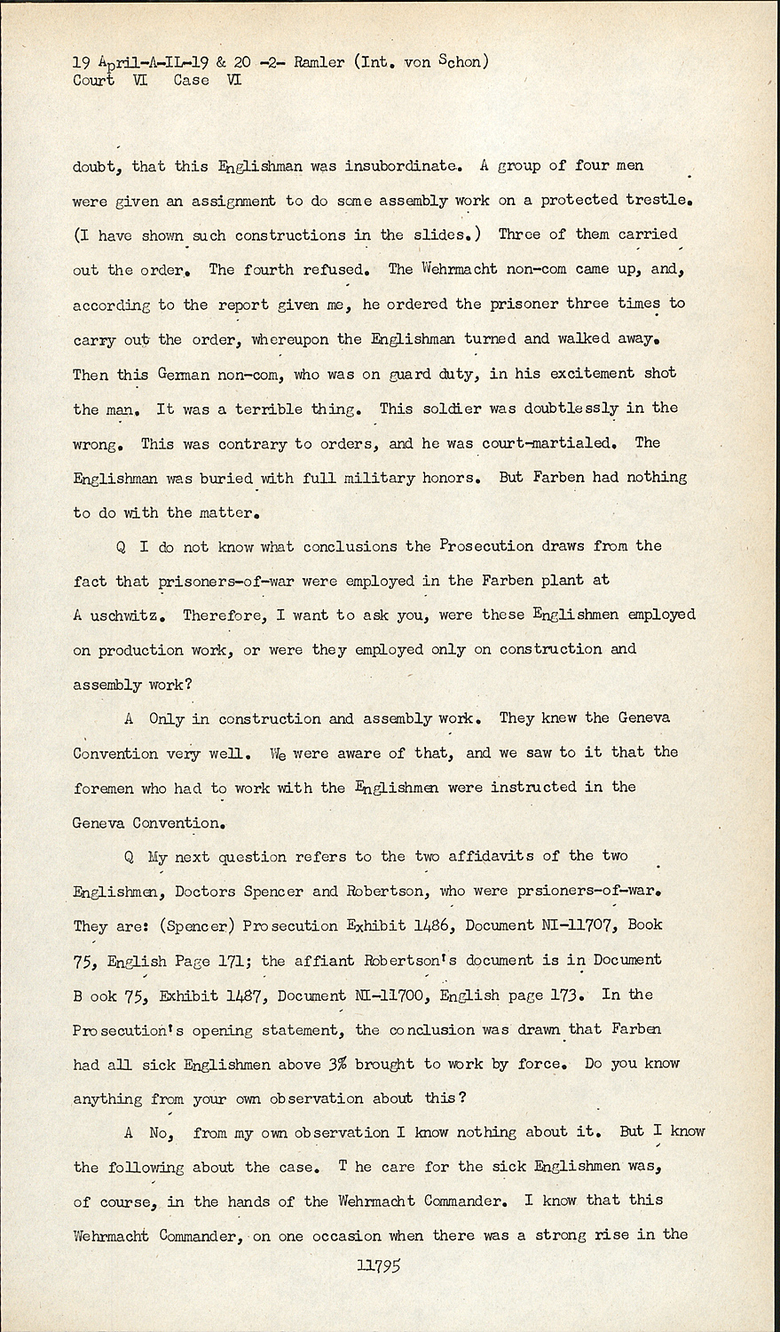 A group of four men were given an assignment to do some assembly work on a protected trestle. (I have shown such constructions in the slides.) Three of them carried out the order. The fourth refused. The Wehrmacht non-com came up, and, according to the report given me, he ordered the prisoner three times to carry out the order, whereupon the Englishman turned and walked away. Then this Geiman non-com, who was on guard duty, in his excitement shot the man. It was a terrible thing. This soldier was doubtlessly in the wrong. This was contrary to orders, and he was court-martialed. The Englishman was buried with full military honors. But Farben had nothing to do with the matter.