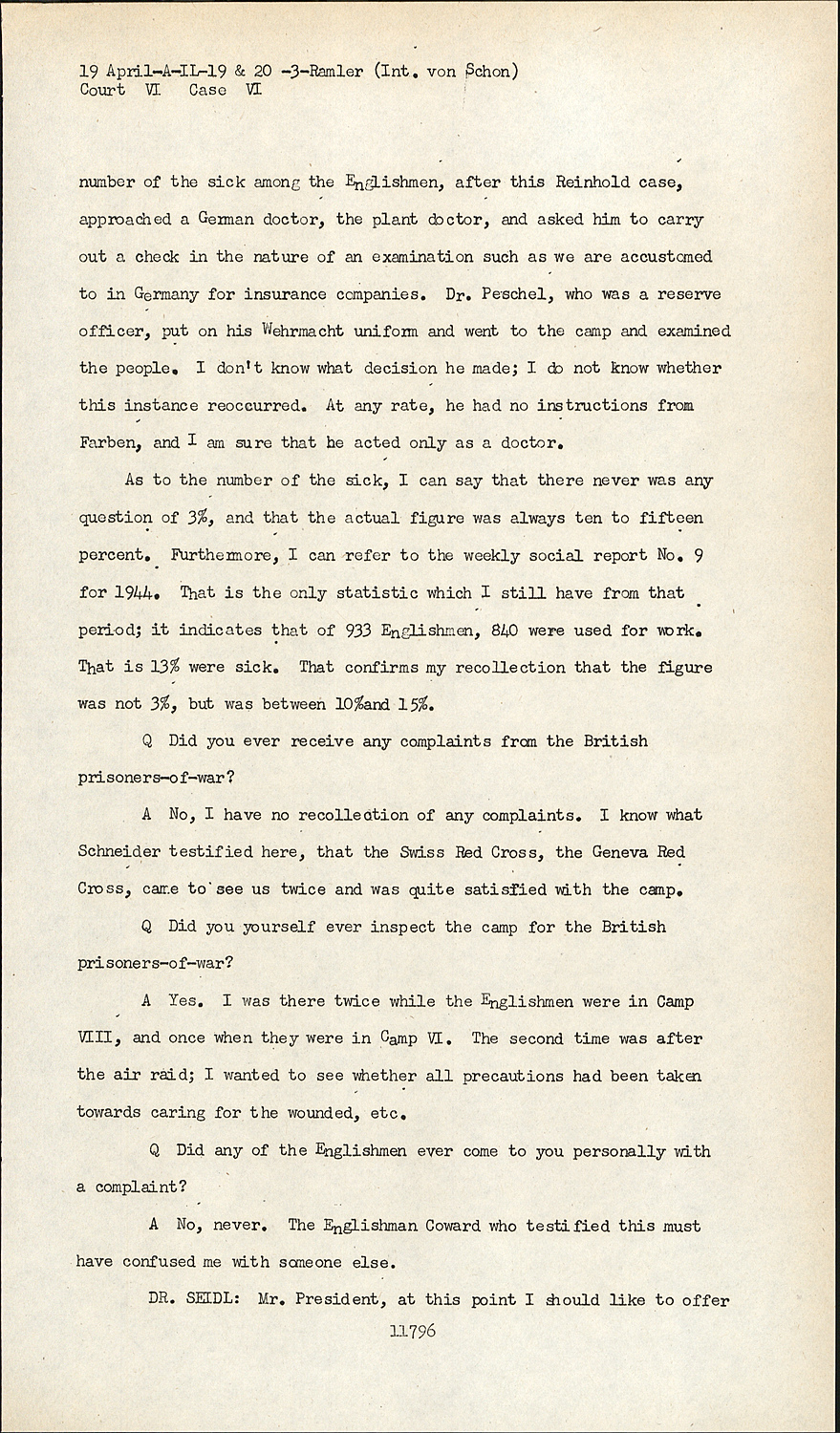 QMy next question refers to the two affidavits of the two Ehglishmaa, Doctors Spencer and Robertson, who were prsioners-of-war. They are: (Spencer) Prosecution Exhibit 1486, Document NI-11707, Book 75, English Page 171; the affiant Robertson's document is in Document Book 75, Exhibit 1487, Document NL-11700, English page 173. In the Prosecution's opening statement, the conclusion was drawn that Farben had all sick Englishmen above 3% brought to work by force. Do you know anything from your own observation about this?