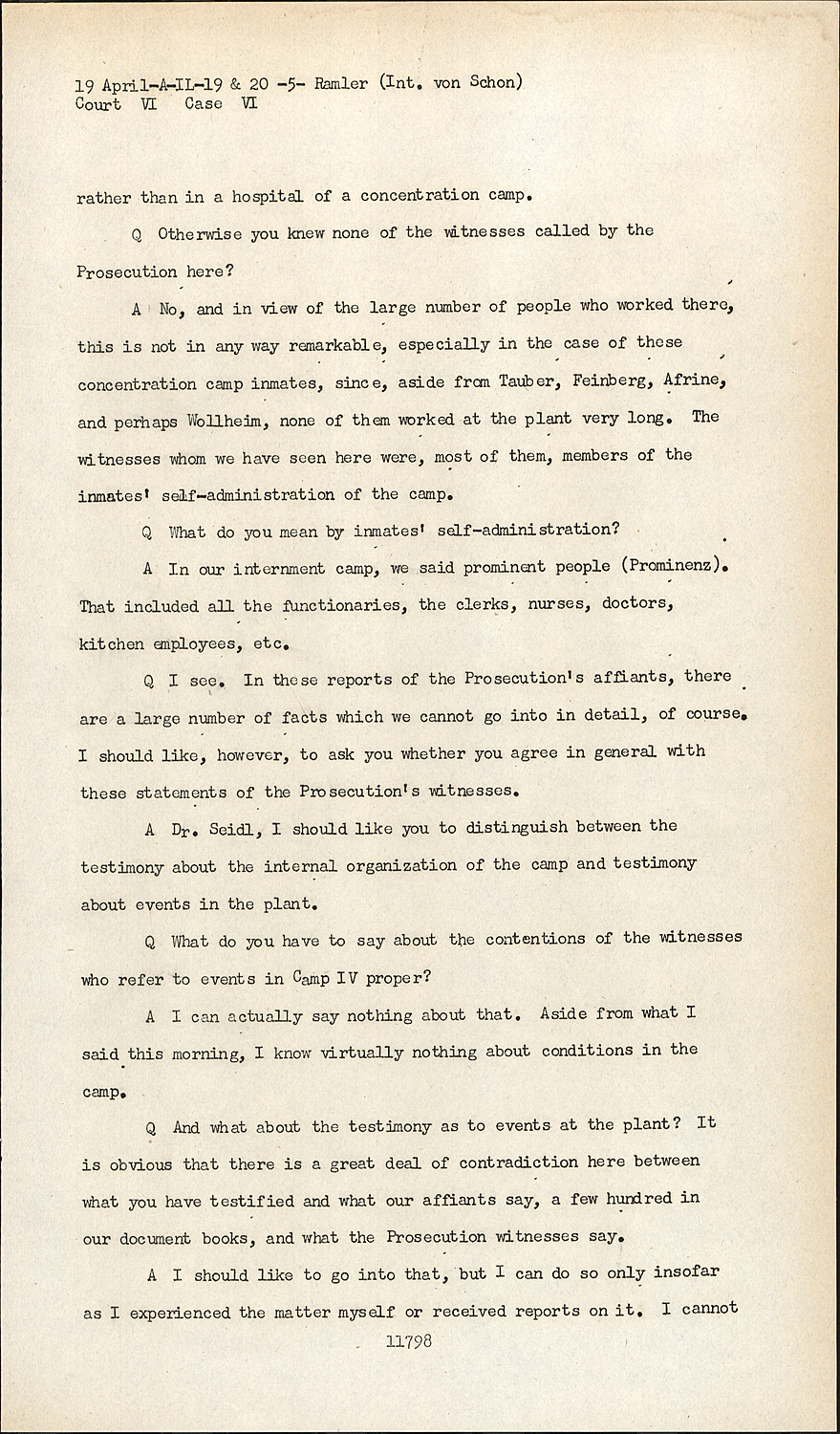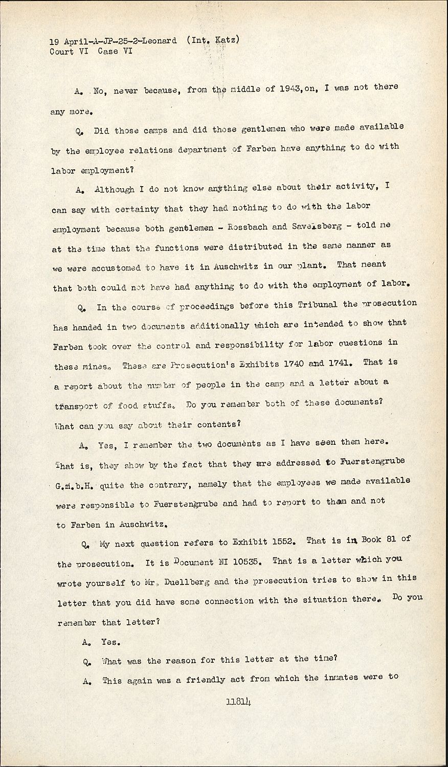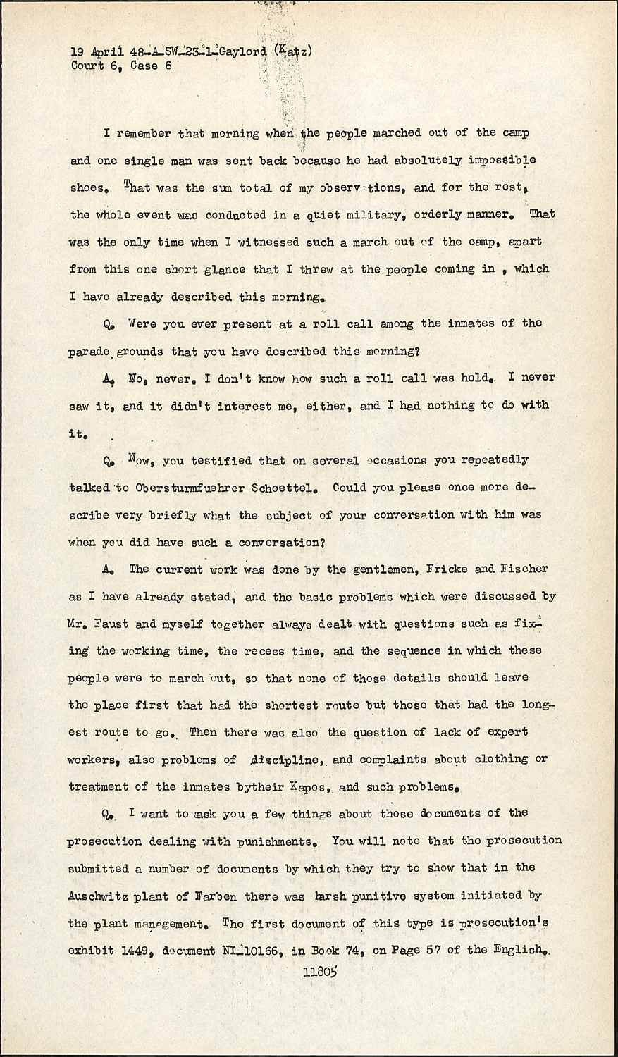 Q.I want to ask you a few things about those documents of the prosecution dealing with punishments. You will note that the prosecution submitted a number of documents by which they try to show that in the Auschwitz plant of Farben there was harsh punitive system initiated by the plant management. The first document of this type is prosecutions exhibit 1449, document NI-10166, in Book 74, on Page 57 of the English.
