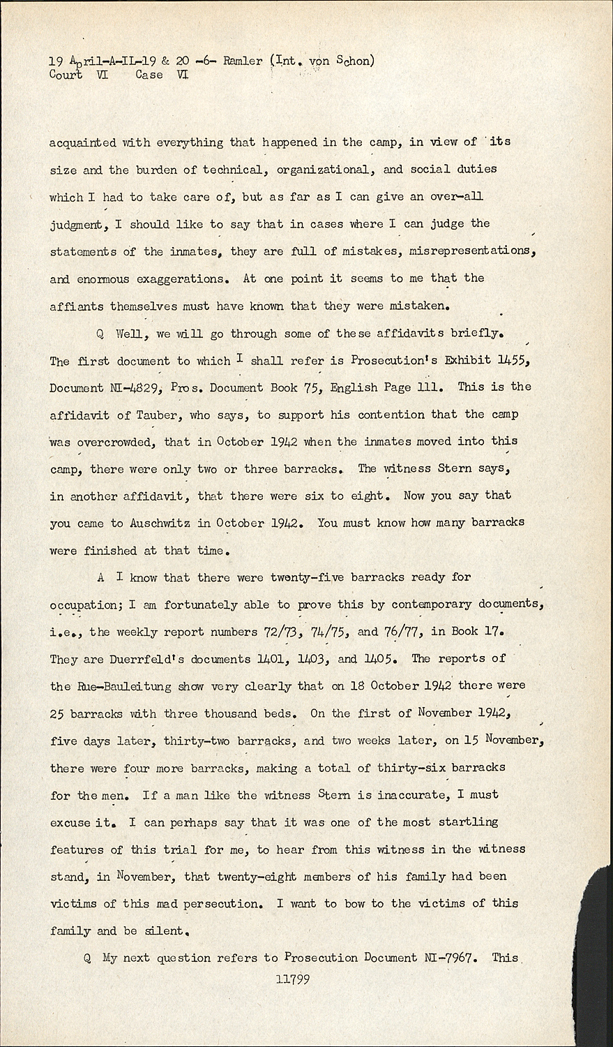 QWell, we will go through some of these affidavits briefly. The first document to which I shall refer is Prosecution's Exhibit 1455, Document NT-4029, Pros. Document Book 75, English Page 111. This is the affidavit of Tauber, who says, to support his contention that the camp was overcrowded, that in October 1942 when the inmates moved into this camp, there were only two or three barracks. The witness Stern says, in another affidavit, that there were six to eight. Now you say that you came to Auschwitz in October 1942. You must know how many barracks were finished at that time.