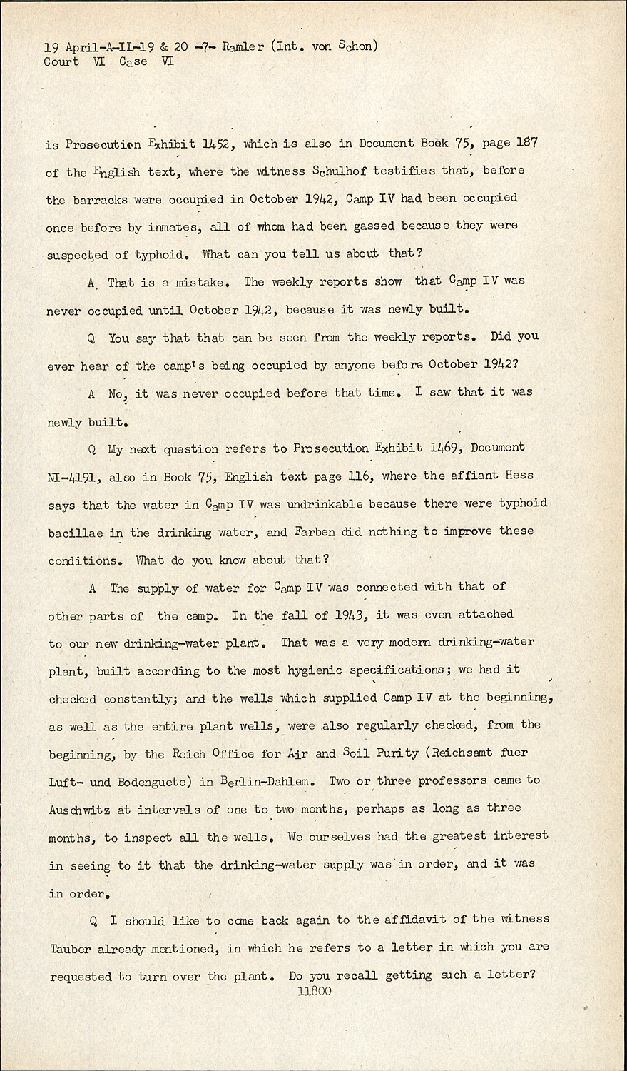 QMy next question refers to Prosecution Exhibit 1469, Document NI-4191, also in Book 75, English text page 116, where the affiant Hess says that the water in Camp IV was undrinkable because there were typhoid bacillae in the drinking water, and Farben did nothing to improve these conditions. What do you know about that?