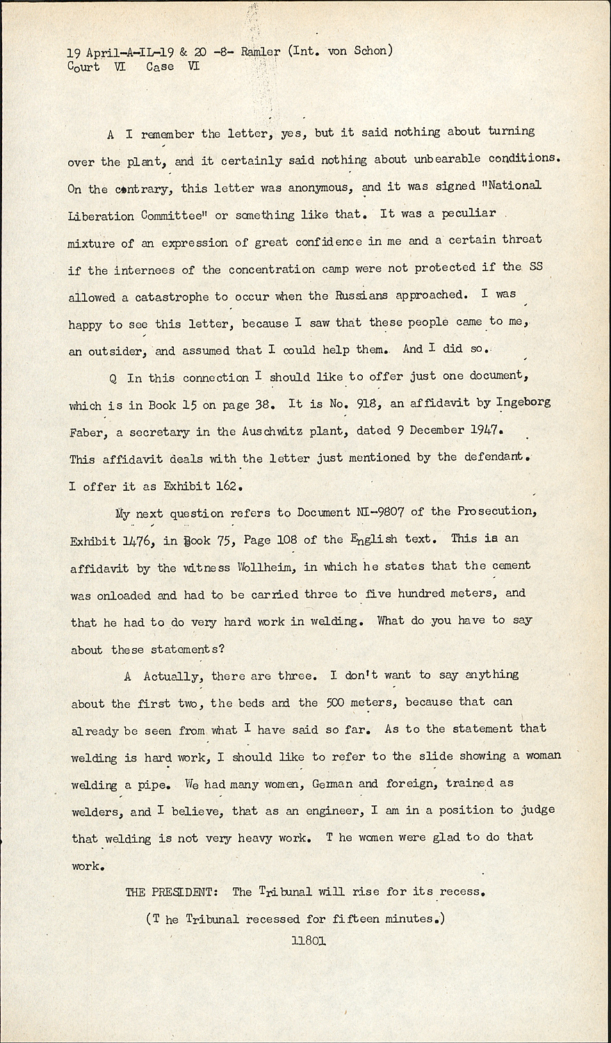 QIn this connection I should like to offer just one document, which is in Book 15 on page 38. It is No. 918, an affidavit by Ingeborg Faber, a secretary in the Auschwitz plant, dated 9 December 1947. This affidavit deals with the letter just mentioned by the defendant. I offer it as Exhibit 162.