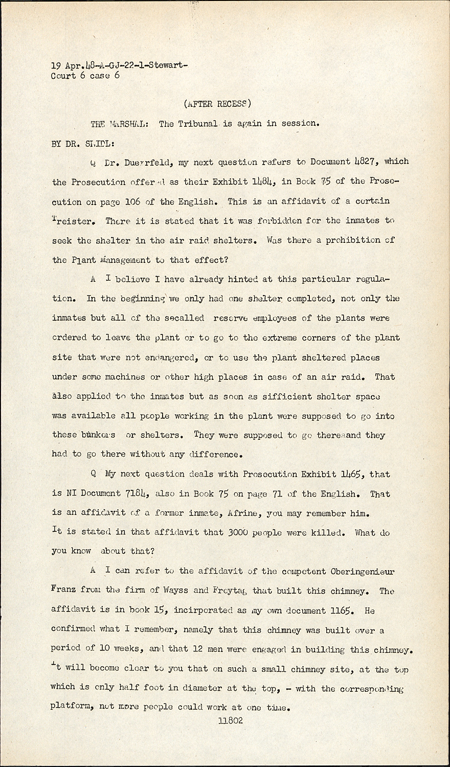 QDr. Duerrfeld, my next question refers to Document 4827, which the Prosecution offered as their Exhibit 1484, in Book 75 of the Prosecution on page 106 of the English. This is an affidavit of a certain Treister. There it is stated that it was forbidden for the inmates to seek the shelter in the air raid shelters. Was there a prohibition of the Plant Management to that effect?