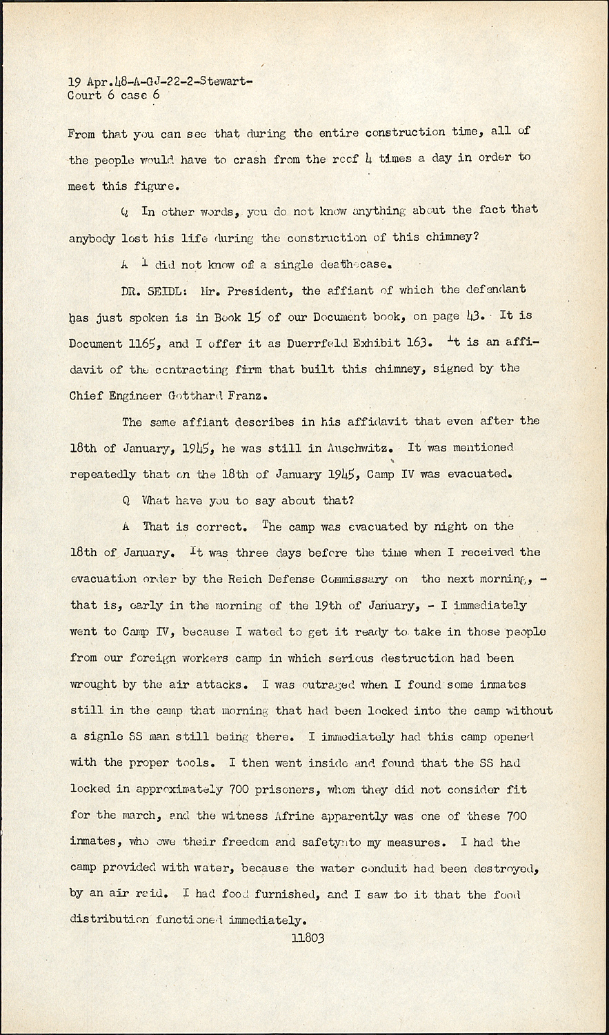 DR. SEIDL:Mr. President, the affiant of which the defendant has just spoken is in Book 15 of our Document book, on page 43. It is Document 1165, and I offer it as Duerrfeld Exhibit 163. It is an affidavit of the contracting firm that built this chimney, signed by the Chief Engineer Gotthard Franz.