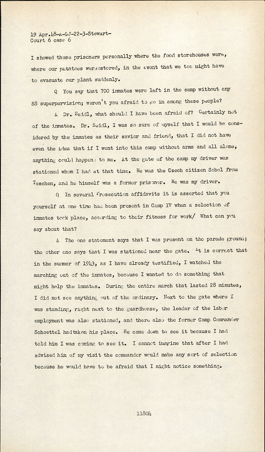 AThe one statement says that I was present on the parade ground; the other one says that I was stationed near the gate. It is correct that in the summer of 1943, as I have already testified, I watched the marching out of the inmates, because I wanted to do something that might help the inmates. During the entire march that lasted 28 minutes, I did not see anything out of the ordinary. Next to the gate where I was standing, right next to the guardhouse, the leader of the labor employment was also stationed, and there also the former Camp Commander Schoettel hadtaken his place. He came down to see it because I had told him I was coming to see it. I cannot imagine that after I had advised him of my visit the commander would make any sort of selection because he would have to be afraid that I might notice something.