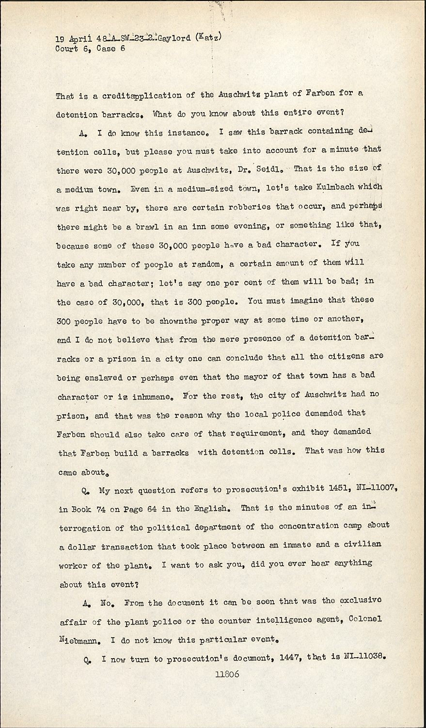 A.I do know this instance. I saw this barrack containing detention cells, but please you must take into account for a minute that there were 30,000 people at Auschwitz, Dr. Seidl. That is the size of a medium town. Even in a medium-sized town, let's take Kulmbach which was right near by, there are certain robberies that occur, and perhaps there might be a brawl in an inn some evening, or something like that, because some of these 30,000 people have a bad character. If you take any number of people at random, a certain amount of them will have a bad character; let's say one per cent of them will be bad; in the case of 30,000, that is 300 people. You must imagine that these 300 people have to be shownthe proper way at some time or another, and I do not believe that from the mere presence of a detention barracks or a prison in a city one can conclude that all the citizens are being enslaved or perhaps even that the mayor of that town has a bad character or is inhumane. For the rest, the city of Auschwitz had no prison, and that was the reason why the local police demanded that Farben should also take care of that requirement, and they demanded that Farben build a barracks with detention cells. That was how this came about.