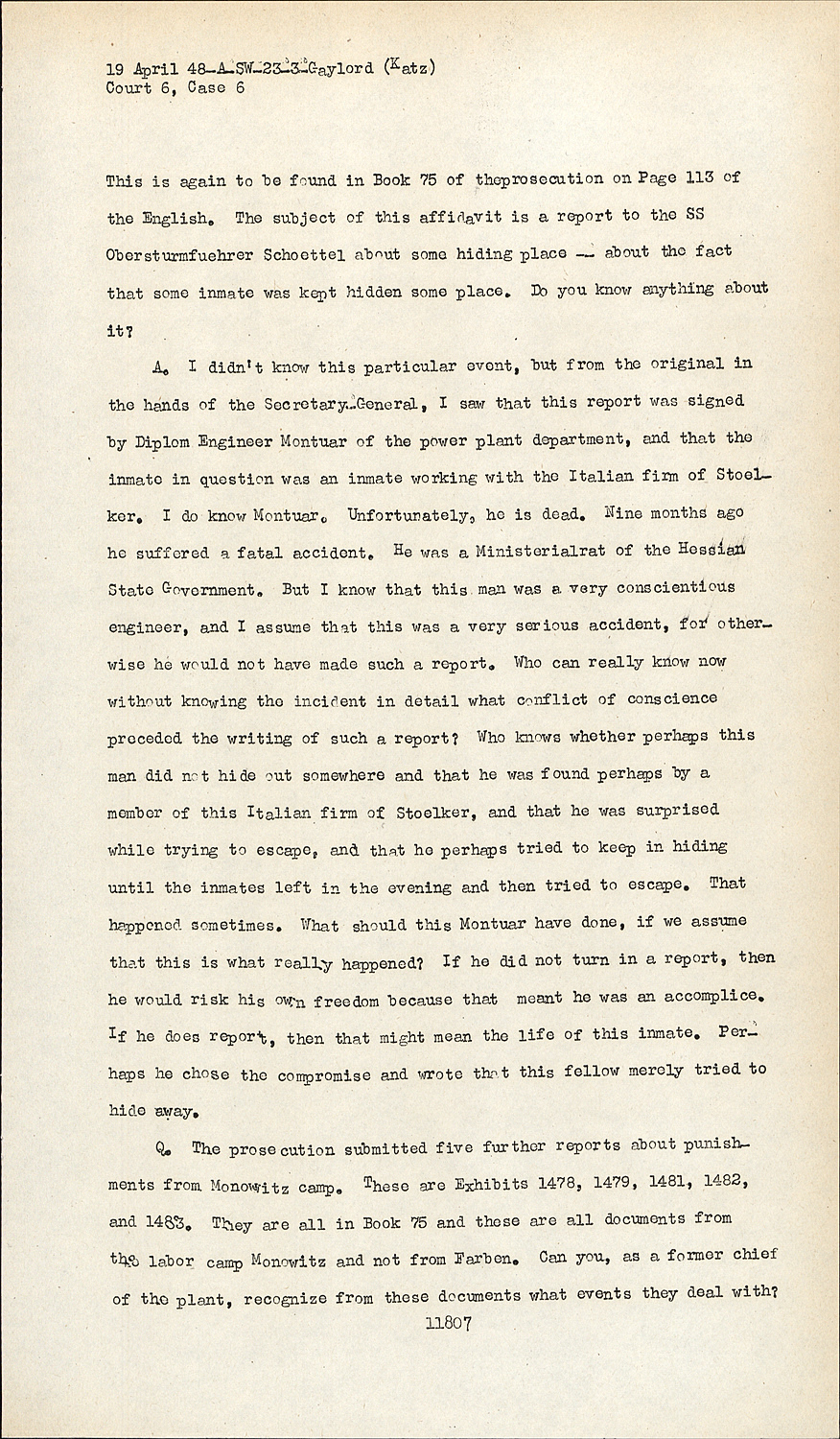 A.I didn't know this particular event, but from the original in the hands of the Secretary-General, I saw that this report was signed by Diplom Engineer Montuar of the power plant department, and that the inmate in question was an inmate working with the Italian firm of Stoelker. I do know Montuar. Unfortunately, he is dead. Nine months ago he suffered a fatal accident. He was a Ministerialrat of the Hessian State Government. But I know that this man was a very conscientious engineer, and I assume that this was a very serious accident, for otherwise he would not have made such a report. Who can really know now without knowing the incident in detail what conflict of conscience preceded the writing of such a report? Who knows whether perhegps this man did not hide out somewhere and that he was found perhaps by a member of this Italian firm of Stoelker, and that he was surprised while trying to escape, and that he perhaps tried to keep in hiding until the inmates left in the evening and then tried to escape. That happened sometimes. What should this Montuar have done, if we assume that this is what really happened? If he did not turn in a report, then he would risk his freedom because that meant he was an accomplice. If he does report, then that might mean the life of this inmate. Perhaps he chose the compromise and wrote that this fellow merely tried to hide away.