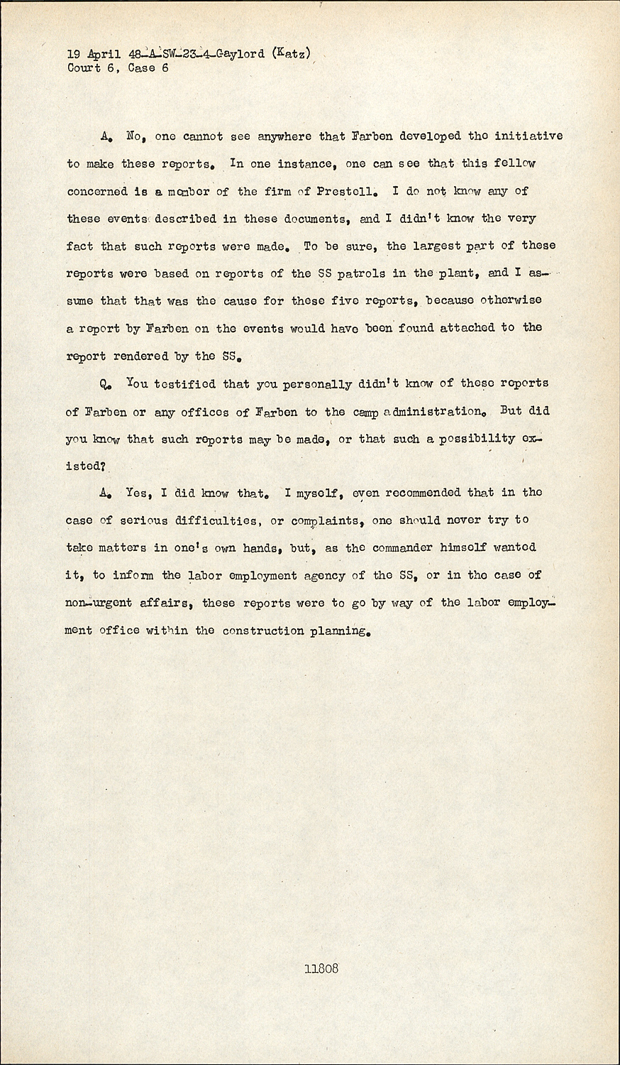Q.You testified that you personally didn't know of these reports of Farben or any offices of Farben to the camp administration. But did you know that such reports may be made, or that such a possibility existed?