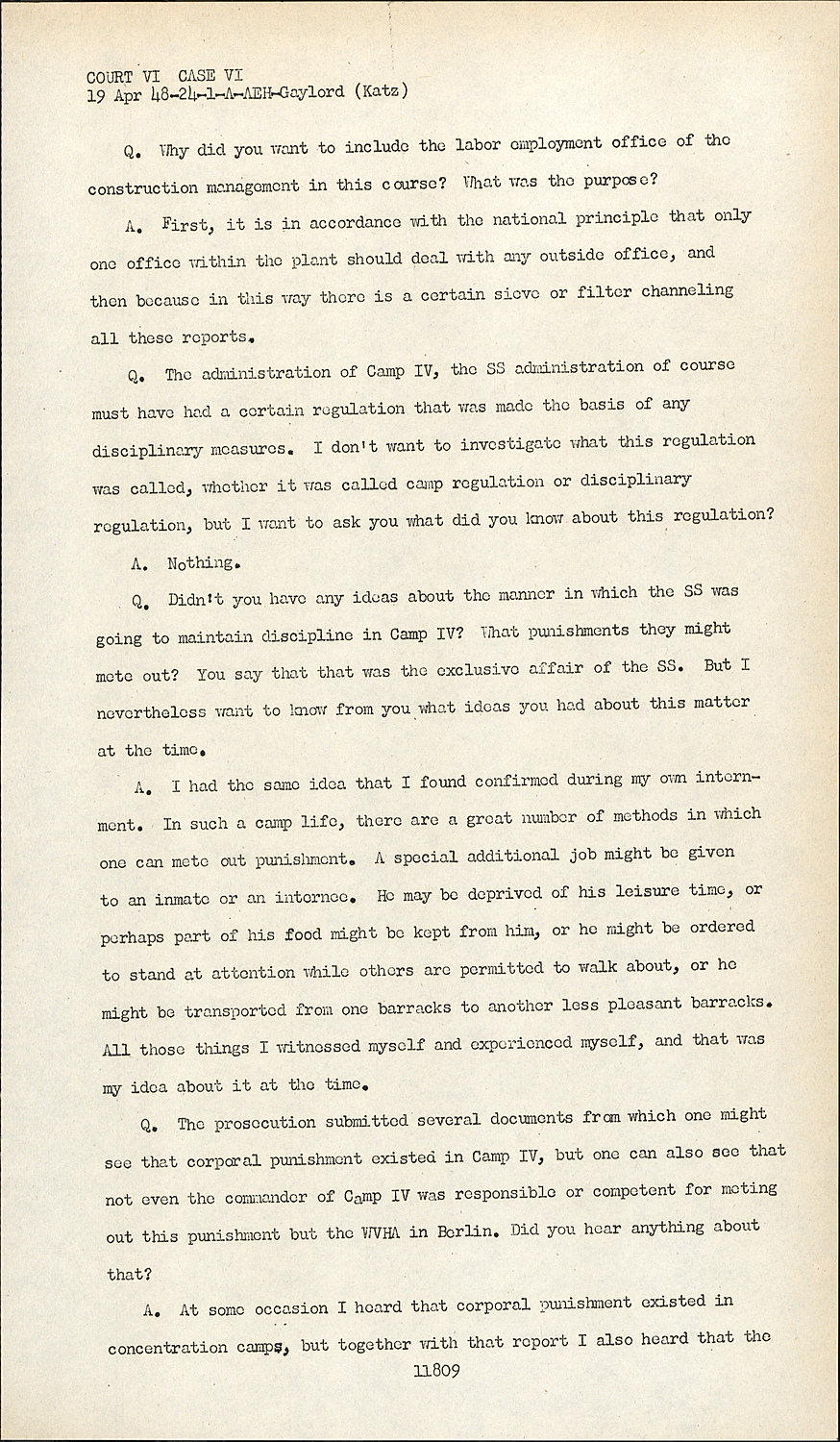 Q.Didn't you have any ideas about the manner in which the SS was going to maintain discipline in Camp IV? What punishments they might mete out? You say that that was the exclusive affair of the SS. But I nevertheless want to know from you what ideas you had about this matter at the time.