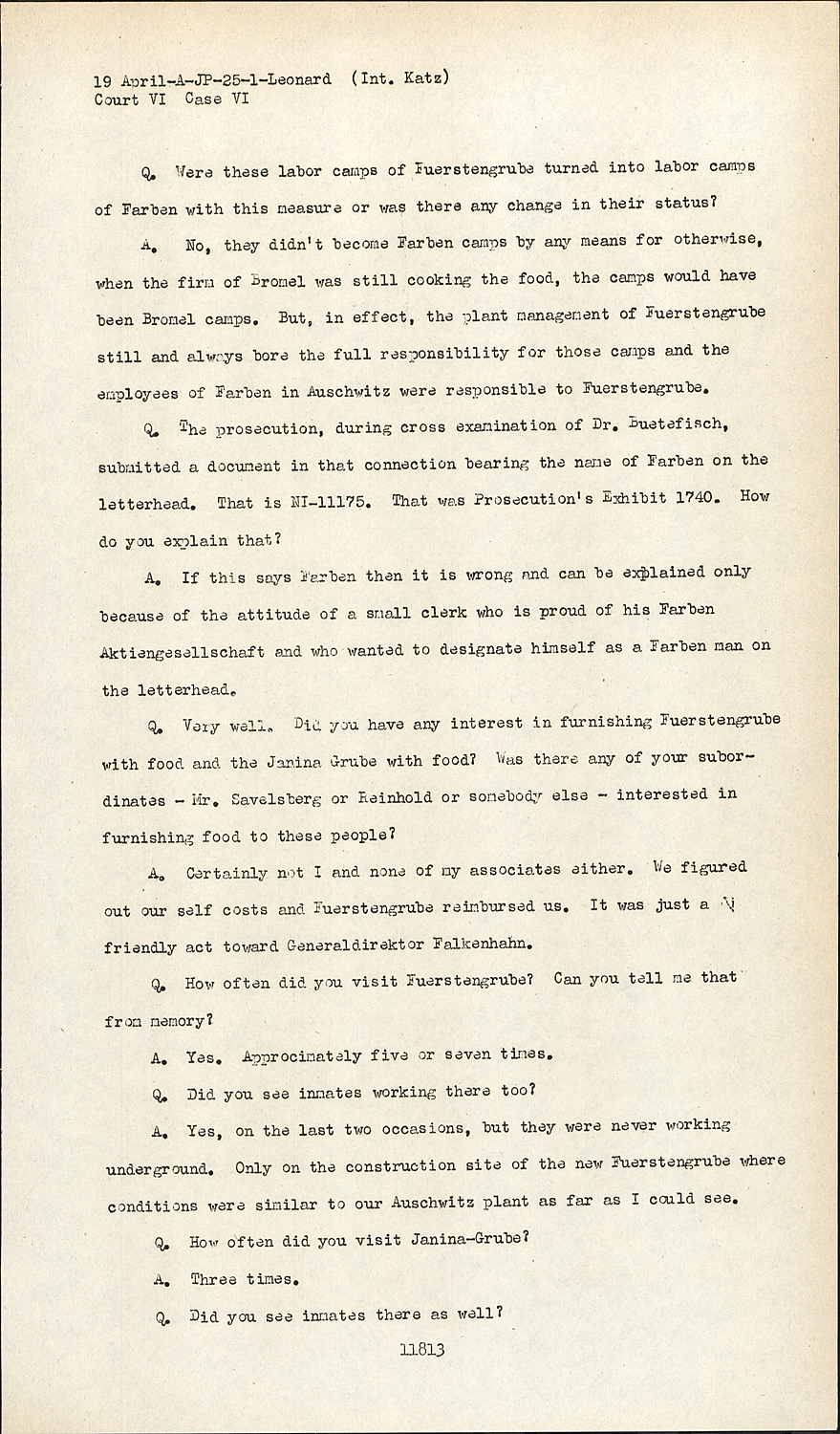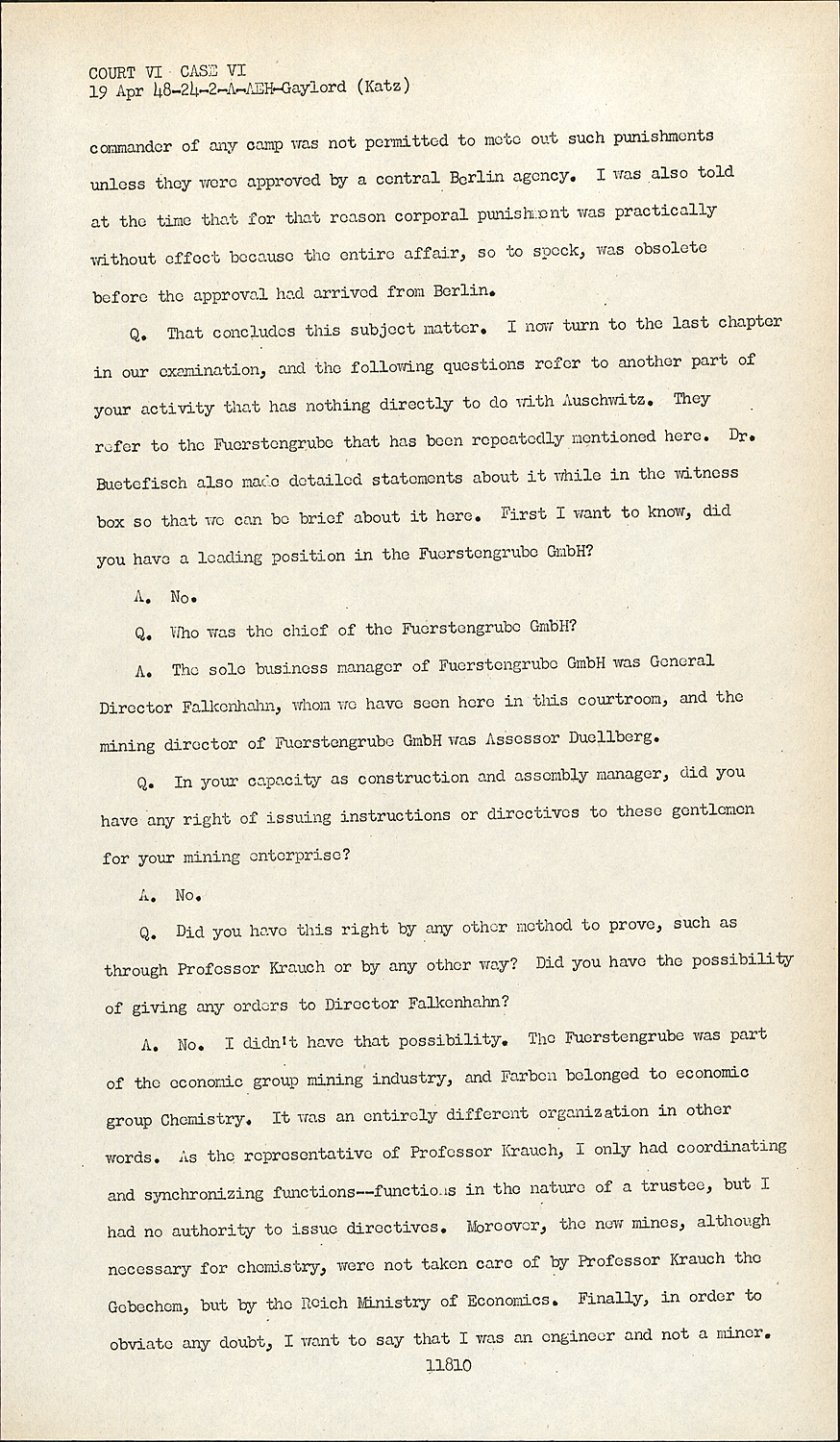 Q.That concludes this subject matter. I now turn to the last chapter in our examination, and the following questions refer to another part of your activity that has nothing directly to do with Auschwitz. They refer to the Fuerstengrube that has been repeatedly mentioned here. Dr. Buetefisch also made detailed statements about it while in the witness box so that we can be brief about it here. First I want to know, did you have a leading position in the Fuerstengrube GmbH?