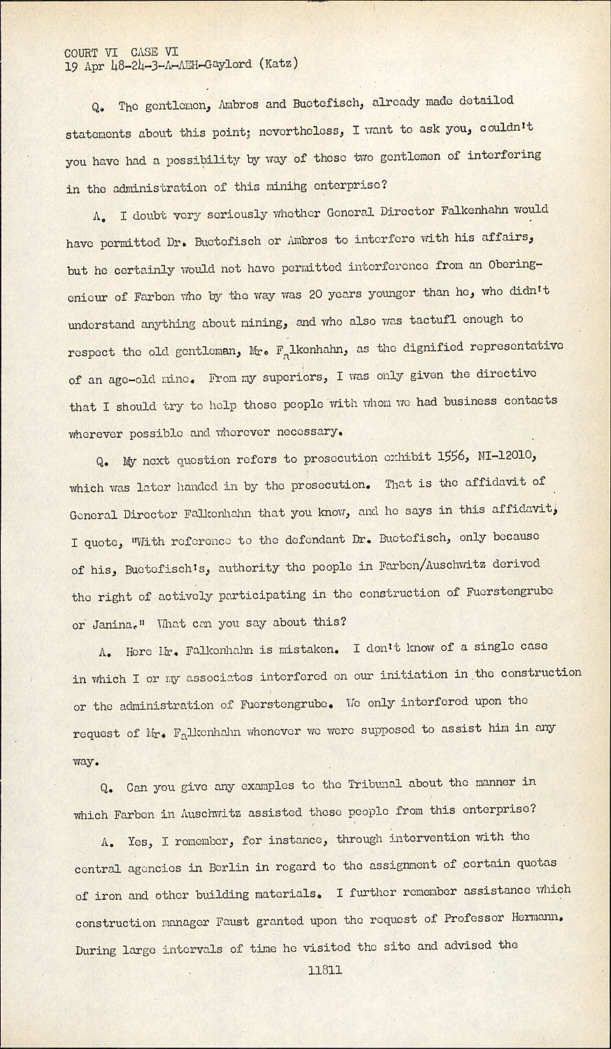 Q.Can you give any examples to the Tribunal about the manner in which Farben in Auschwitz assisted these people from this enterprise?