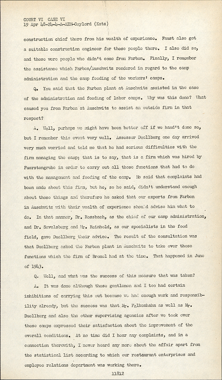 Faust also got a suitable construction engineer for these people there. I also did so, and these were people who didn't come from Farben. Finally, I remember the assistance which Farben/Auschwitz rendered in regard to the camp administration and the camp feeding of the workers' camps.