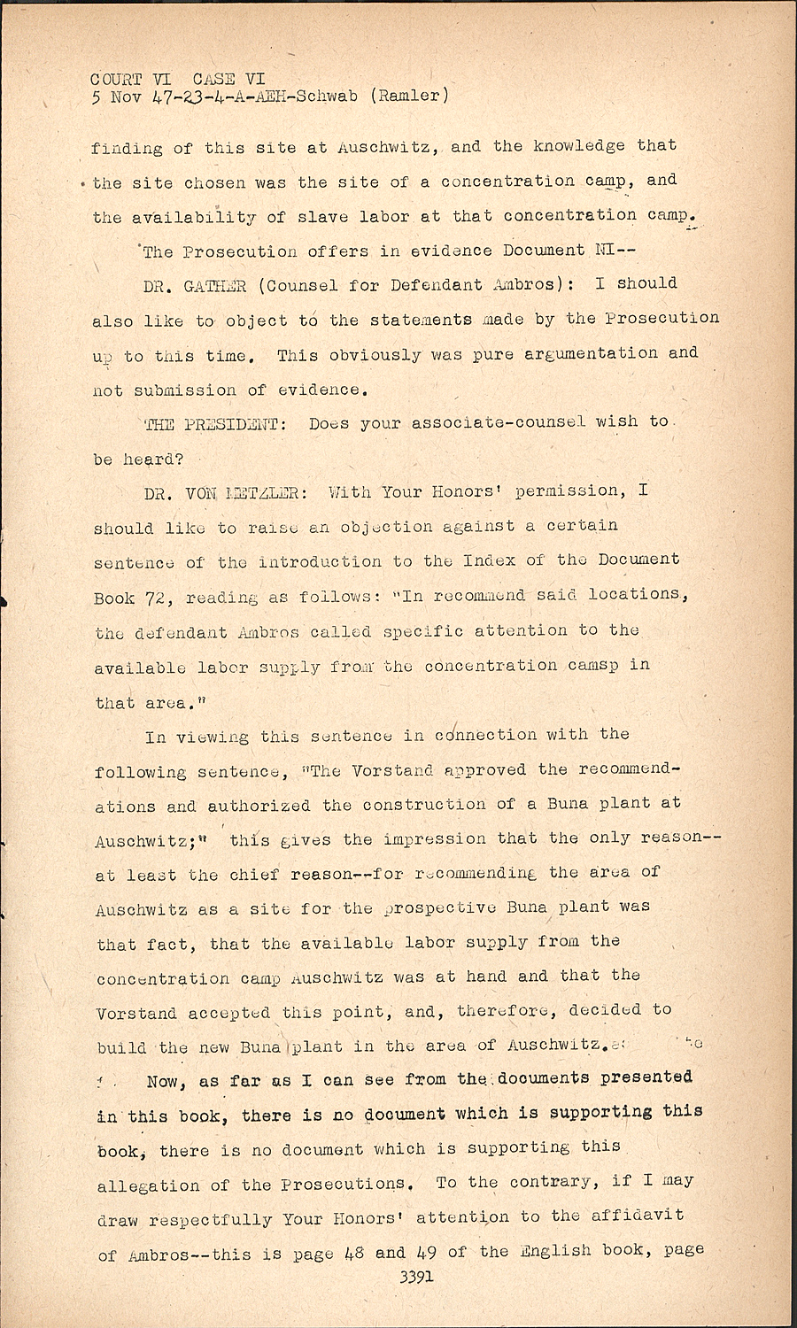 DR. VON METZLER:With Your Honors' permission, I should like to raise an objection against a certain sentence of the introduction to the Index of the Document Book 72, reading as follows: "In recommend said locations, the defendant Ambros called specific attention to the available labor supply from the concentration camp in that area."