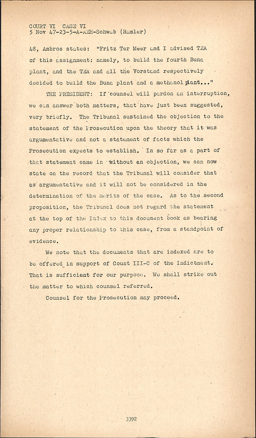 THE PRESIDENT:If counsel will pardon an interruption, we can answer both matters, that have just been suggested, very briefly. The Tribunal sustained the objection to the statement of the Prosecution upon the theory that it was argumentative and not a statement of facts which the Prosecution expects to establish. In so far as a part of that statement came in Without an objection, we can now state on the record that the Tribunal will consider that as argumentative and it will not be considered in the determination of the merits of the case. As to the second proposition, the Tribunal does not regard the statement at the top of the Index to this document book as bearing any proper relationship to this case, from a standpoint of evidence.