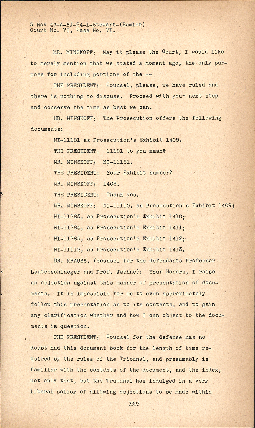 DR.KRAUSS, (counsel for the defendants Professor Lautenschlaeger and Prof. Jaehne): Your Honors, I raise an objection against this manner of presentation of documents. It is impossible for me to even approximately follow this presentation as to its contents, and to gain any clarification whether and how I can object to the documents in question.