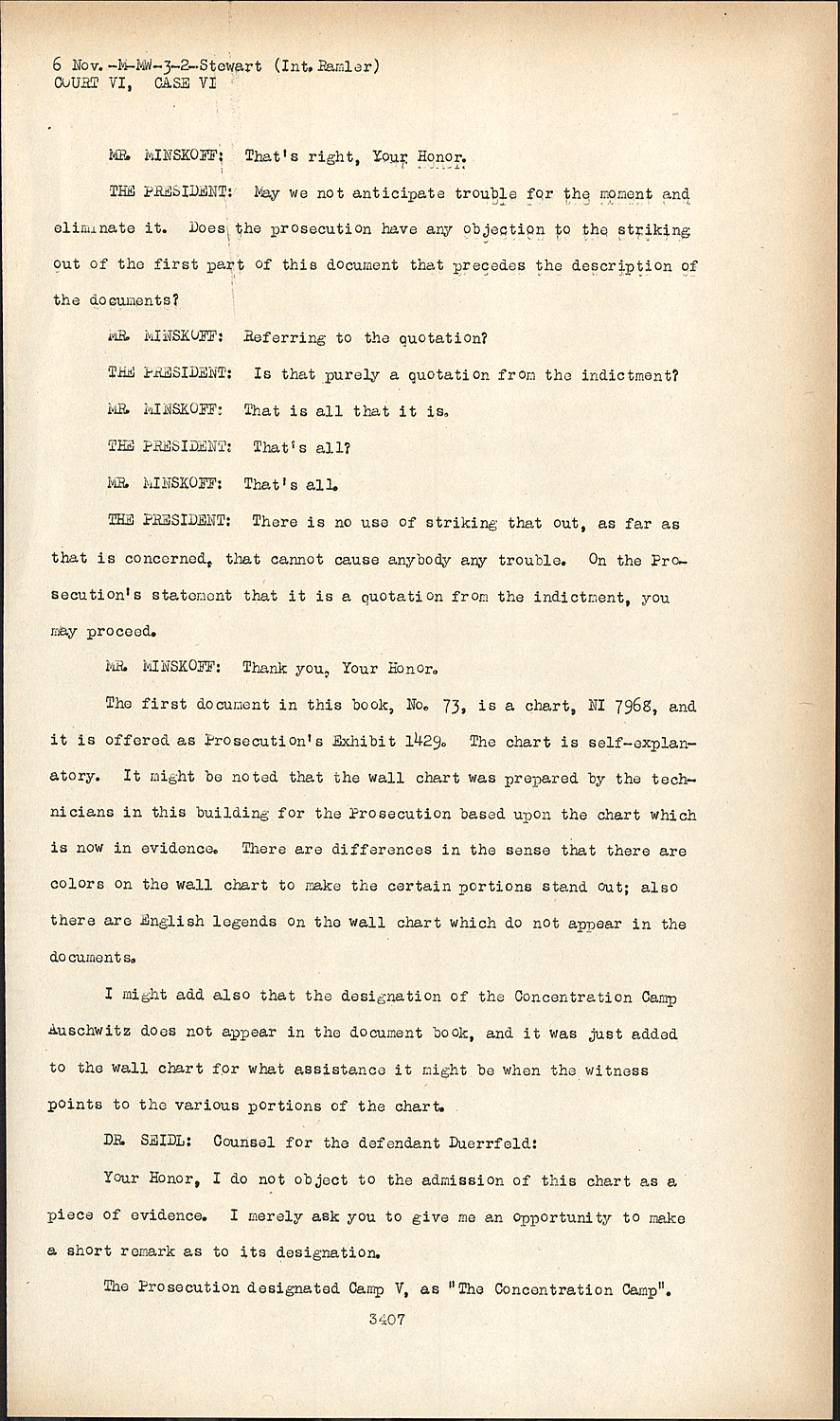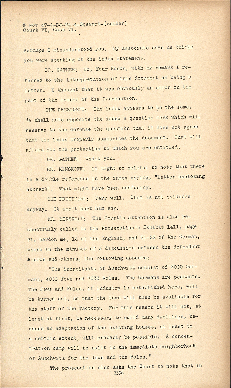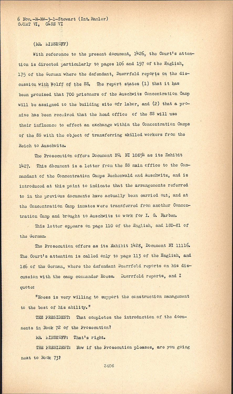 MR. MINSKOFF:May it please the Court, referring to Prosecution Exhibit 1412, the Court's attention is called to the fact that in this document, as in the previous exhibit, it is indicated that one of the considerations for choosing Auschwitz as a site for the Buna plant is the existence of the concentration camp Auschwitz.