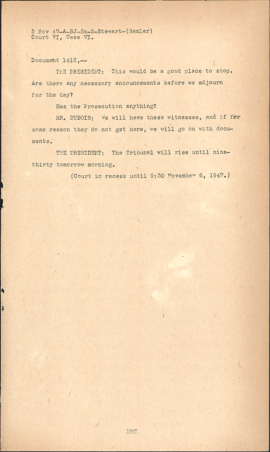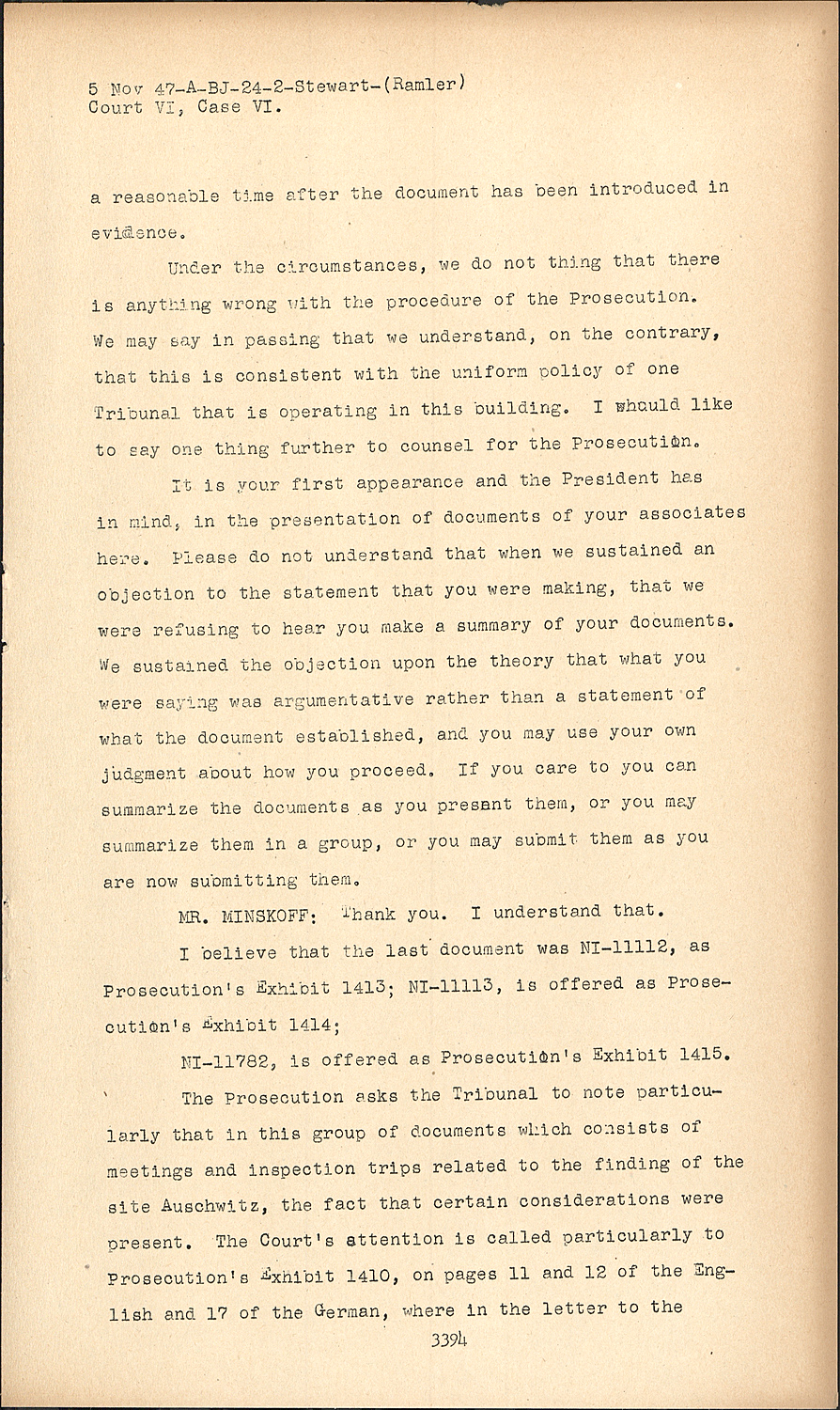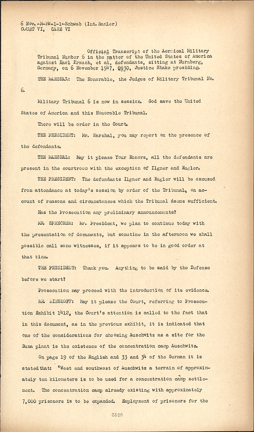 MR. MINSKOFF:May it please the Court, referring to Prosecution Exhibit 1412, the Court's attention is called to the fact that in this document, as in the previous exhibit, it is indicated that one of the considerations for choosing Auschwitz as a site for the Buna plant is the existence of the concentration camp Auschwitz.