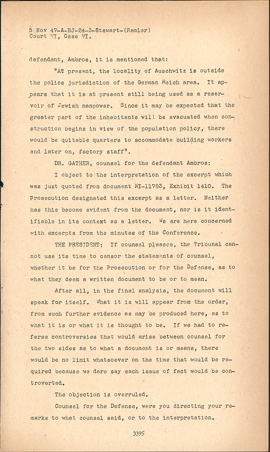 The Prosecution asks the Tribunal to note particularly that in this group of documents which consists of meetings and inspection trips related to the finding of the site Auschwitz, the fact that certain considerations were present. The Court's attention is called particularly to Prosecution's Exhibit 1410, on pages 11 and 12 of the English and 17 of the German, where in the letter to the defendant, Ambros, it is mentioned that: