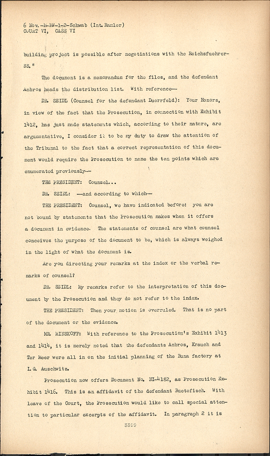 DR.SEIDL (Counsel for the defendant Duerrfeld): Your Honors, in view of the fact that the Prosecution, in connection with Exhibit 1412, has just made statements which, according to their nature, are argumentative, I consider it to be my duty to draw the attention of the Tribunal to the fact that a correct representation of this document would require the Prosecution to name the ten points which are enumerated previously-