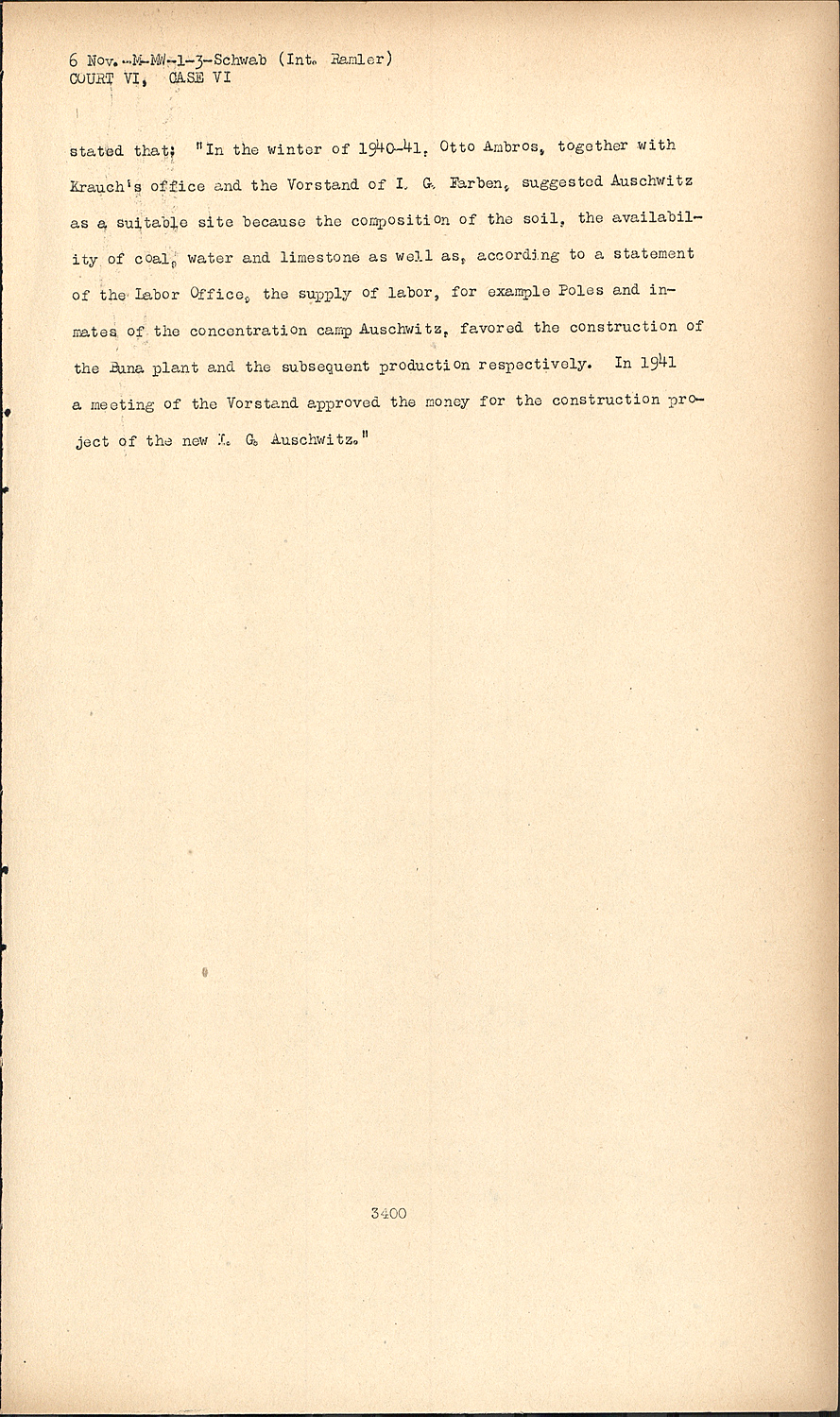 "In the winter of 1940-41, Otto Ambros, together with Krauch's office and the Vorstand of I. G. Farben, suggested Auschwitz as a suitable site because the composition of the soil, the availability of coal water and limestone as well as, according to a statement of the labor Office, the supply of labor, for example Poles and inmates of the concentration camp Auschwitz, favored the construction of the Buna plant and the subsequent production respectively. In 1941 a meeting of the Vorstand approved the money for the construction project of the new I. G. Auschwitz."