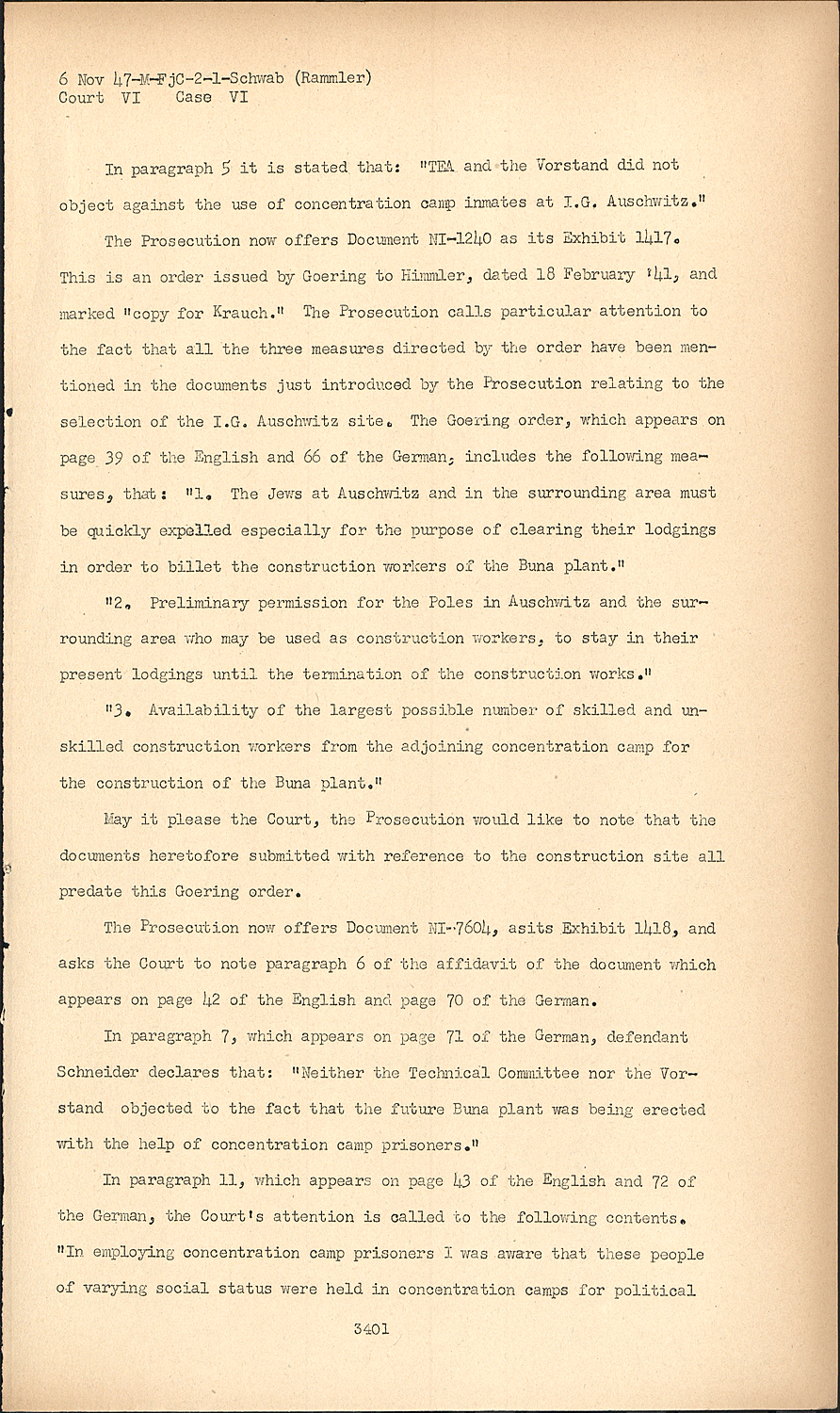 The Prosecution now offers Document NI-1240 as its Exhibit 1417. This is an order issued by Goering to Himmler, dated 18 February '41, and marked "copy for Krauch." The Prosecution calls particular attention to the fact that all the three measures directed by the order have been mentioned in the documents just introduced by the Prosecution relating to the selection of the I.G. Auschwitz site. The Goering order, which appears on page 39 of the English and 66 of the German, includes the following measures, that: "1. The Jews at Auschwitz and in the surrounding area must be quickly expelled especially for the purpose of clearing their lodgings in order to billet the construction workers of the Buna plant."