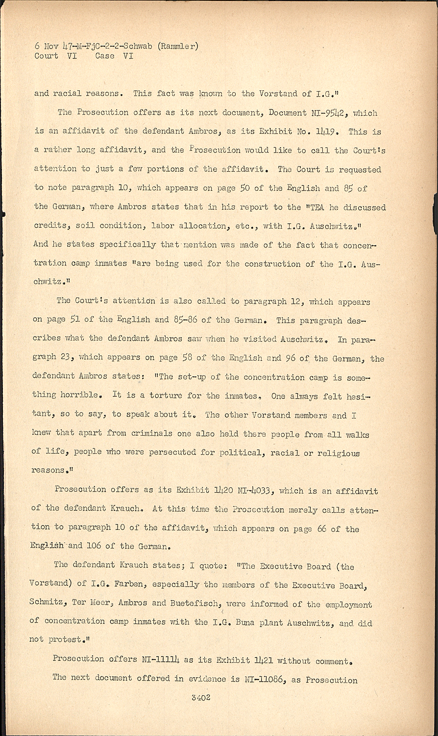 The Prosecution offers as its next document, Document NI-9542, which is an affidavit of the defendant Ambros, as its Exhibit No. 1419. This is a rather long affidavit, and the Prosecution would like to call the Court's attention to just a few portions of the affidavit. The Court is requested to note paragraph 10, which appears on page 50 of the English and 85 of the German, where Ambros states that in his report to the "TEA he discussed credits, soil condition, labor allocation, etc., with I.G. Auschwitz." And he states specifically that mention was made of the fact that concentration camp inmates "are being used for the construction of the I.G. Auschwitz."
