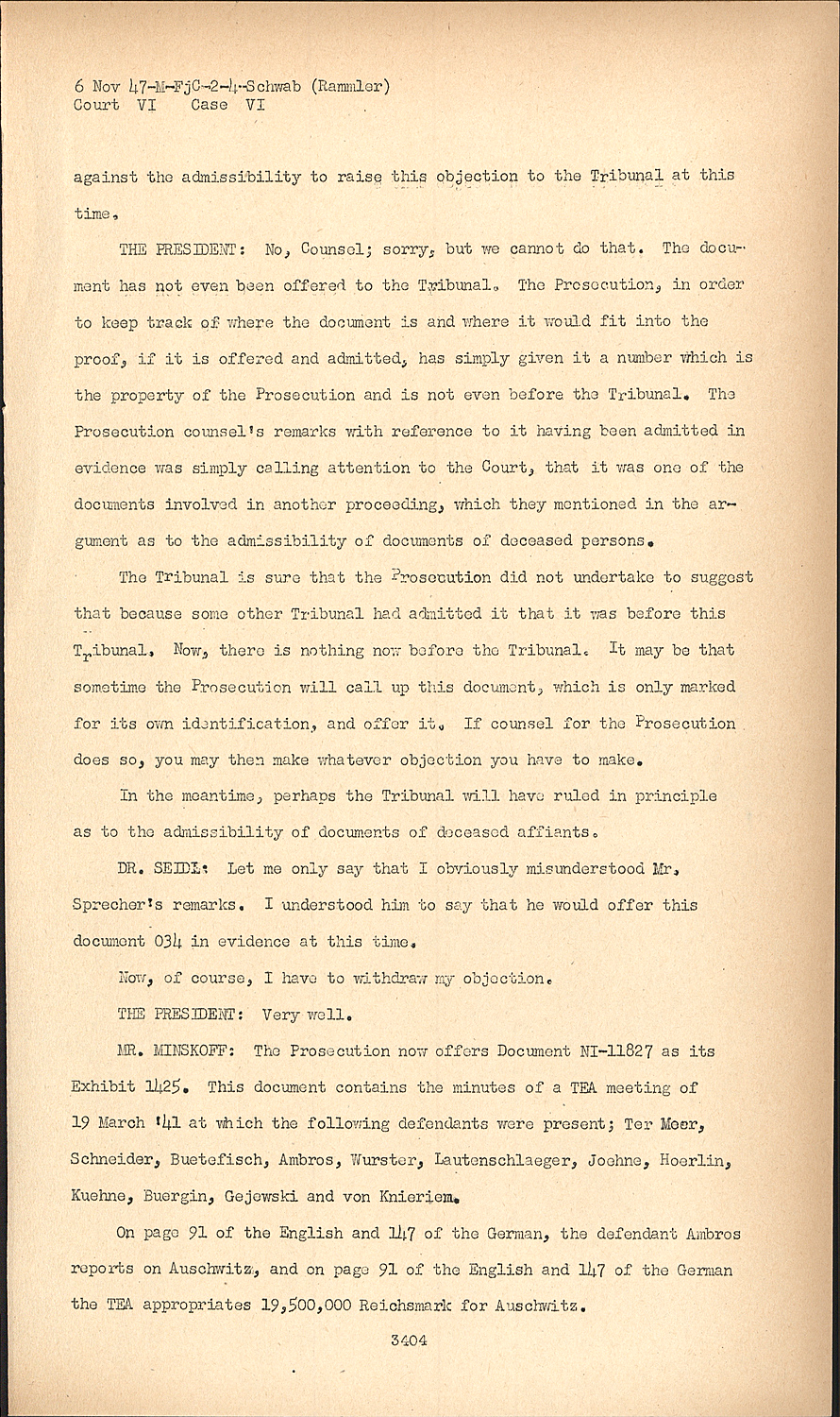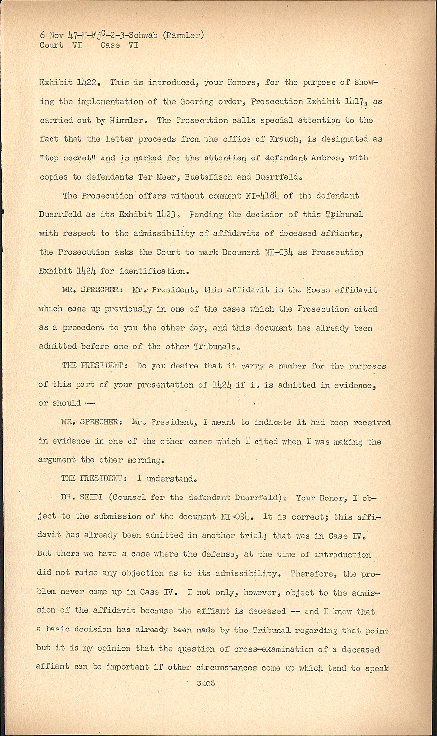 DR.SEIDL (Counsel for the defendant Duerrfeld): Your Honor, I object to the submission of the document NI-034. It is correct; this affidavit has already been admitted in another trial; that was in Case IV. But there we have a case where the defense, at the time of introduction did not raise any objection as to its admissibility. Therefore, the problem never came up in Case IV. I not only, however, object to the admission of the affidavit because the affiant is deceased -- and I know that a basic decision has already been made by the Tribunal regarding that point but it is my opinion that the question of cross-examination of a deceased affiant can be important if other circumstances come up which tend to speak against the admissibility to raise this objection to the Tribunal at this time.