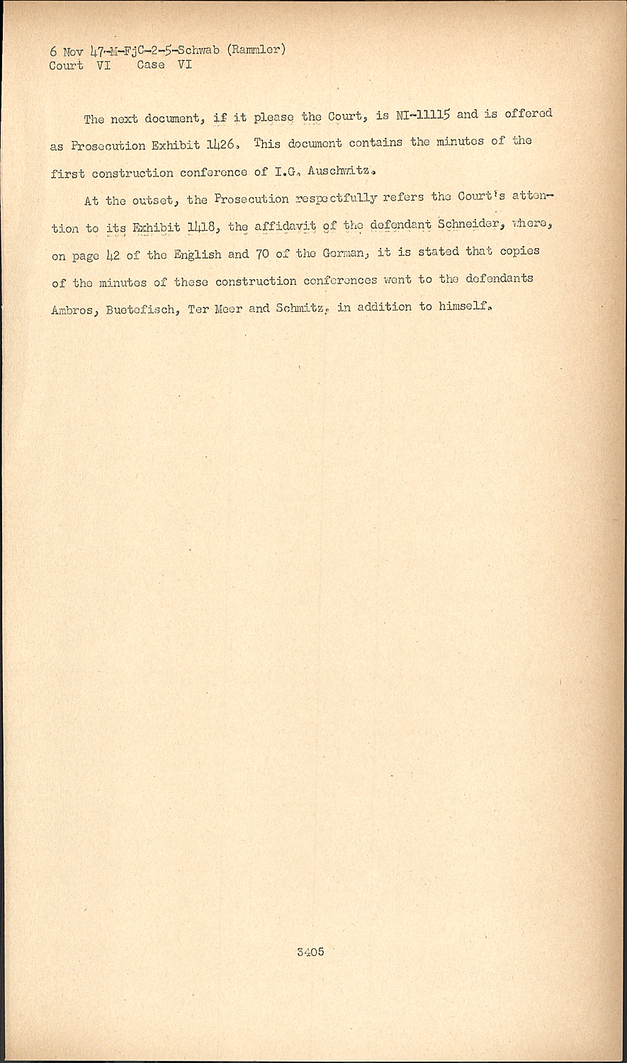 The next document, if it please the Court, is NI-11115 and is offered as Prosecution Exhibit 1426. This document contains the minutes of the first construction conference of I.G. Auschwitz.