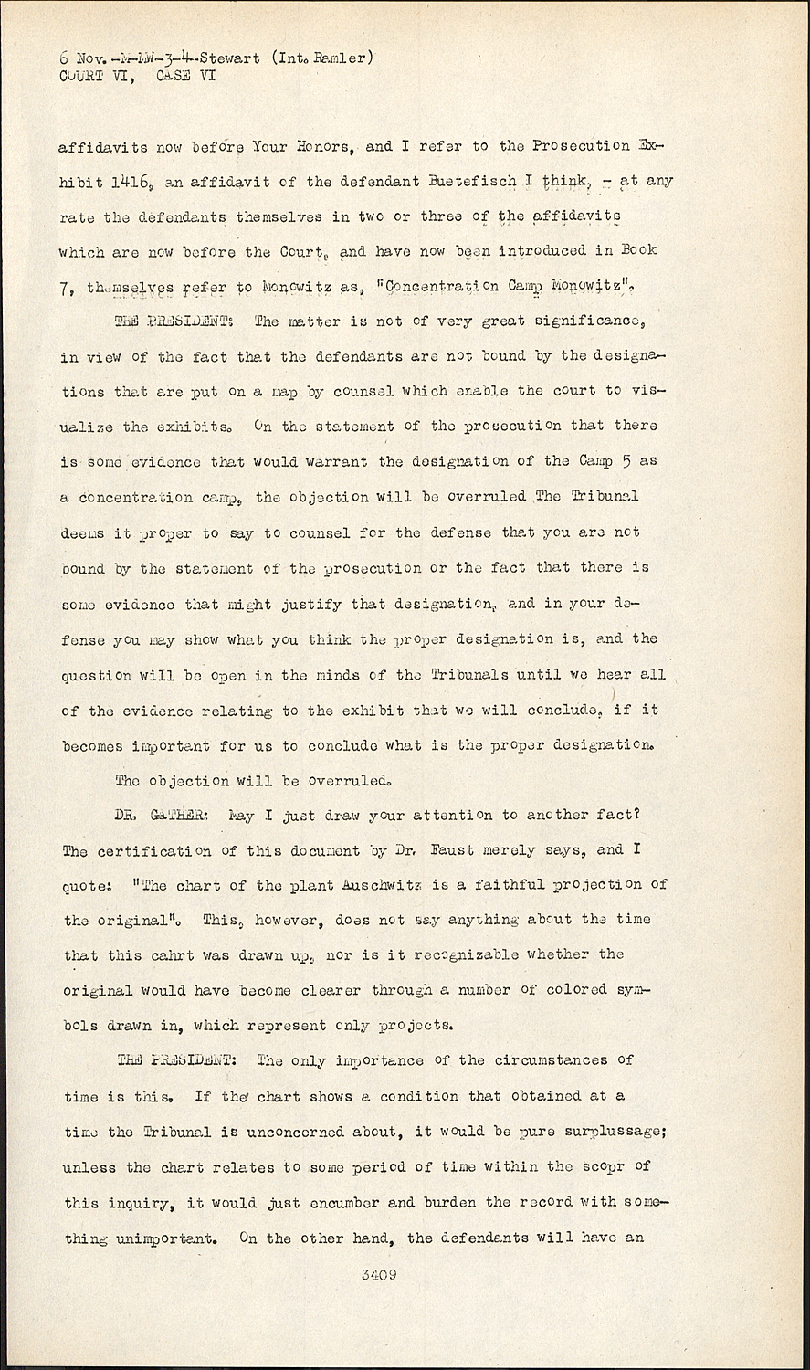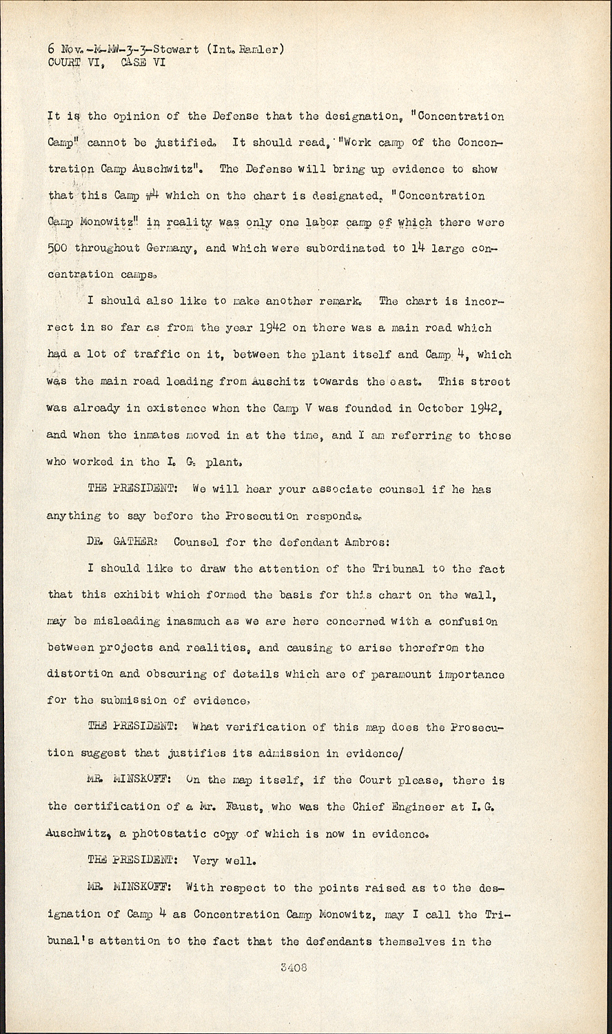 MR. MINSKOFF:With respect to the points raised as to the designation of Camp 4 as Concentration Camp Monowitz, may I call the Tribunal's attention to the fact that the defendants themselves in the affidavits now before Your Honors, and I refer to the Prosecution Exhibit 1416, an affidavit of the defendant Buetefisch I think, - at any rate the defendants themselves in two or three of the affidavits which are now before the Court and have now been introduced in Book 7, themselves refer to Monowitz as, "Concentration Camp Monowitz".