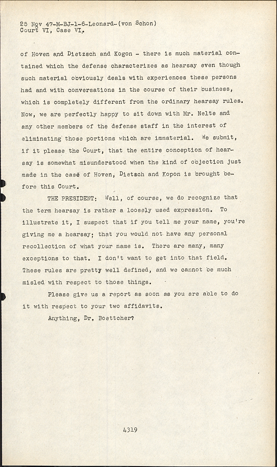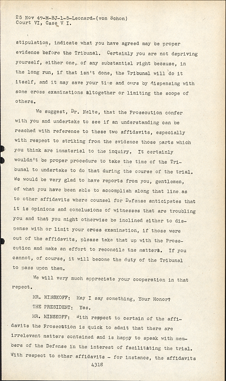 We suggest, Dr. Nelte, that the Prosecution confer with you and undertake to see if an understanding can be reached with reference to these two affidavits, especially with respect to striking from the evidence those parts which you think are immaterial to the inquiry. It certainly wouldn't be proper procedure to take the time of the Tribunal to undertake to do that during the course of the trial. We would be very glad to have reports from you, gentlemen, of what you have been able to accomplish along that line as to other affidavits where counsel for Defense anticipates that it is opinions and conclusions of witnesses that are troubling you and that you might otherwise be inclined either to dispense with or limit your cross examination, if those were out of the affidavits, please take that up with the Prosecution and make an effort to reconcile the matters. If you cannot, of course, it will become the duty of the Tribunal to pass upon them.