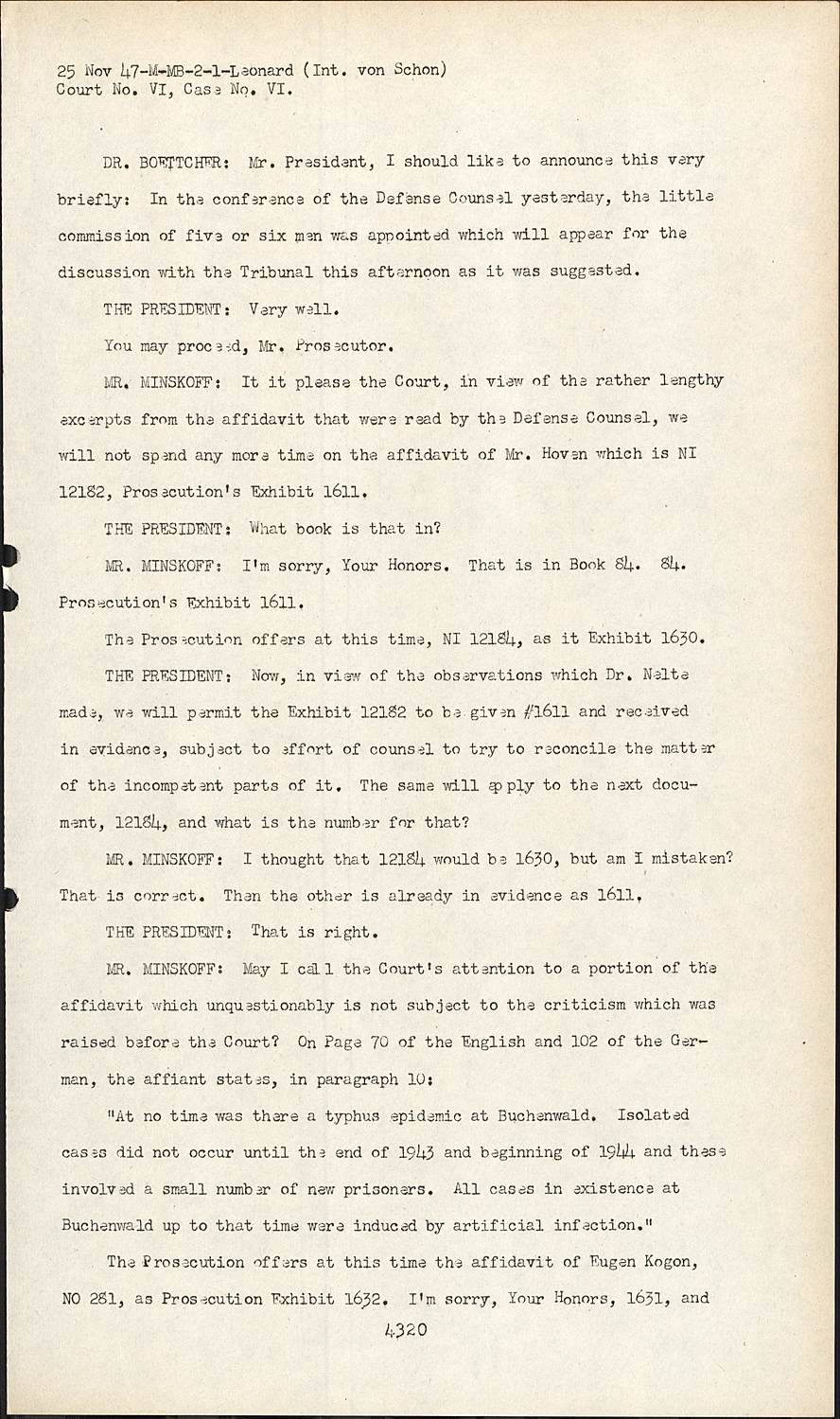 The Prosecution offers at this time the affidavit of Eugen Kogon, NO 281, as Prosecution Exhibit 1632. I'm sorry, Your Honors, 1631, and Court No. VI, Case No. VI.