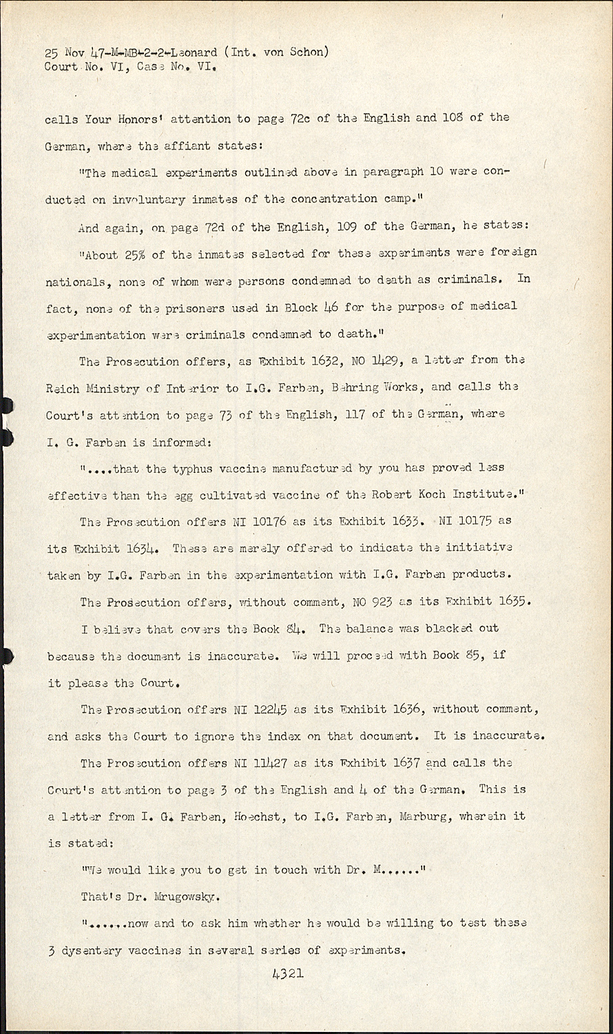 The Prosecution offers NI 11427 as its Exhibit 1637 and calls the Court's attention to page 3 of the English and 4 of the German. This is a letter from I. G. Farben, Hoechst, to I.G. Farben, Marburg, wherein it is stated: