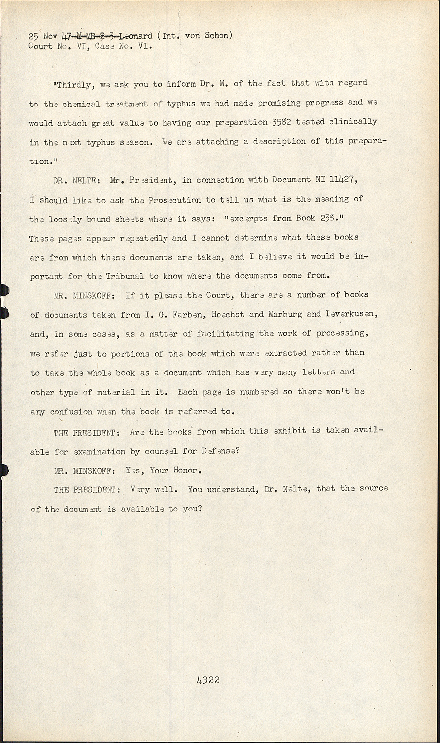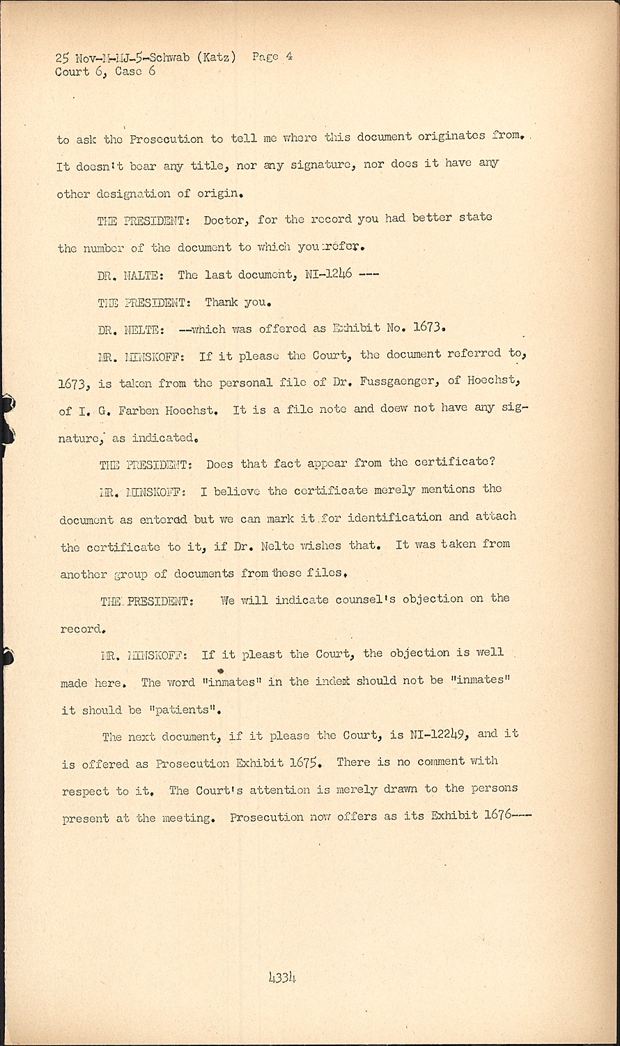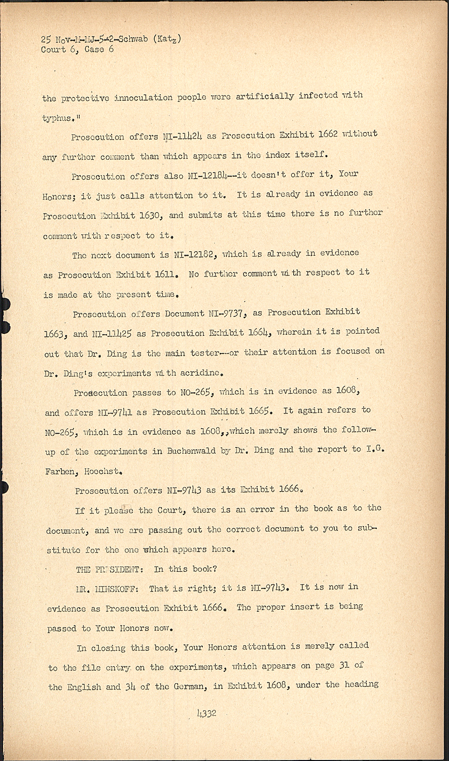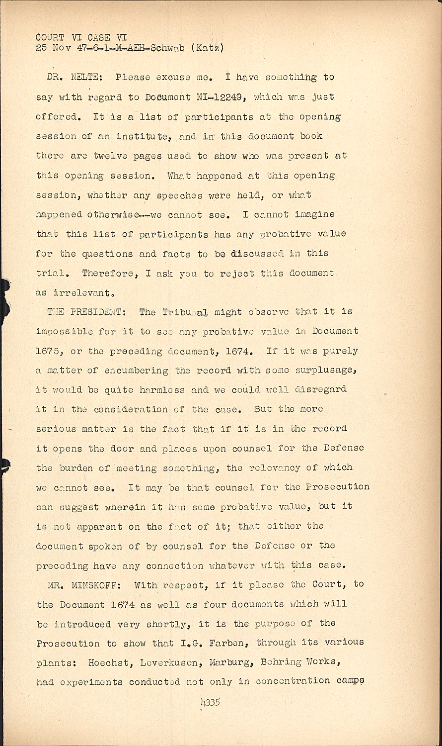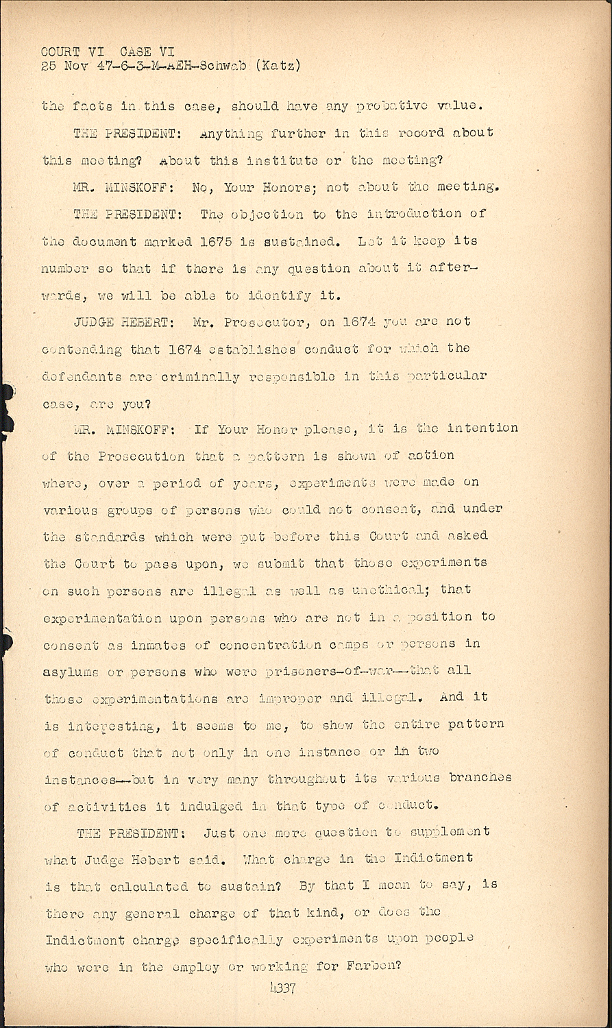 MR. MINSKOFF:With respect, if it please the Court, to the Document 1674 as well as four documents which will be introduced very shortly, it is the purpose of the Prosecution to show that I.G. Farben, through its various plants: Hoechst, Leverkusen, Marburg, Behring Works, had experiments conducted not only in concentration camps COURT VI CASE VI upon inmates, but also upon other groups of persons where their ability to consent would be lacking.