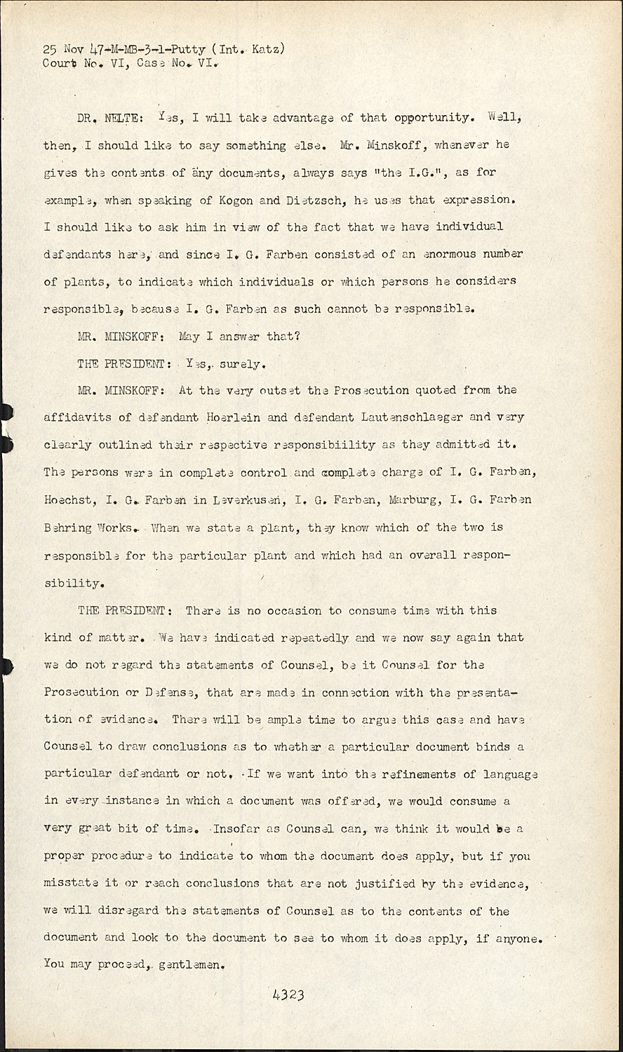 DR. NELTE:Yes, I will take advantage of that opportunity. Well, then, I should like to say something else. Mr. Minskoff, whenever he gives the contents of any documents, always says "the I.G.", as for example, when speaking of Kogon and Dietzsch, he uses that expression. I should like to ask him in view of the fact that we have individual defendants here, and since I. G. Farben consisted of an enormous number of plants, to indicate which individuals or which persons he considers responsible, because I. G. Farben as such cannot be responsible.