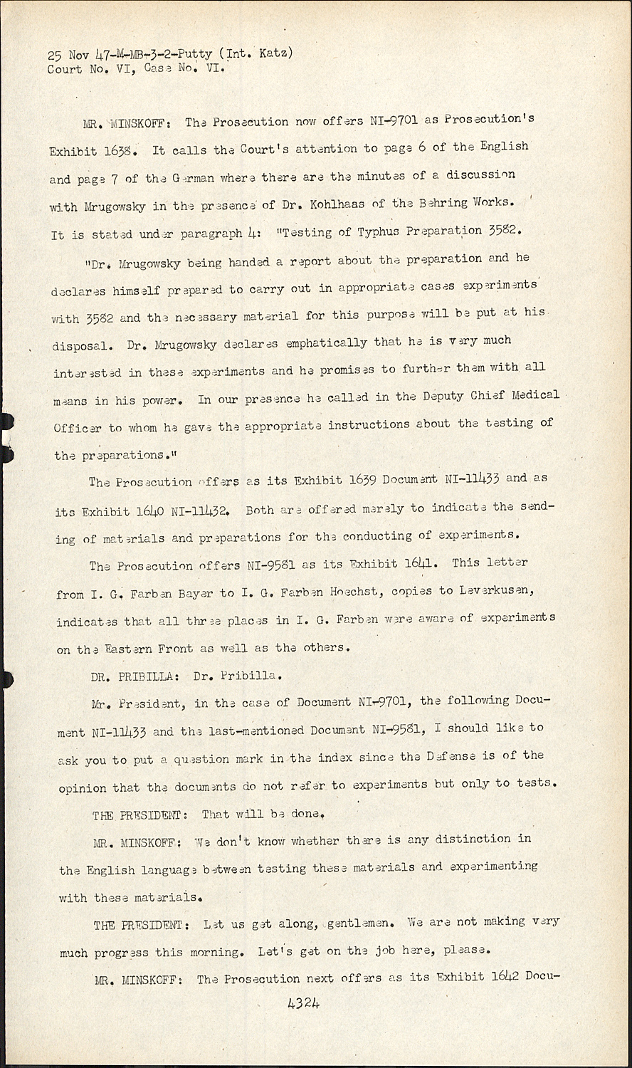 MR. MINSKOFF:The Prosecution now offers NI-9701 as Prosecution's Exhibit 1638. It calls the Court's attention to page 6 of the English and page 7 of the German where there are the minutes of a discussion with Mrugowsky in the presence of Dr. Kohlhaas of the Behring Works. It is stated under paragraph 4: "Testing of Typhus Preparation 3582.