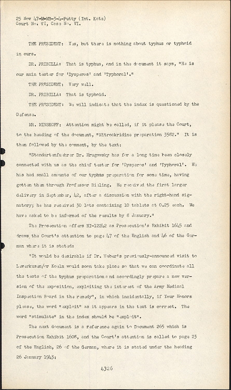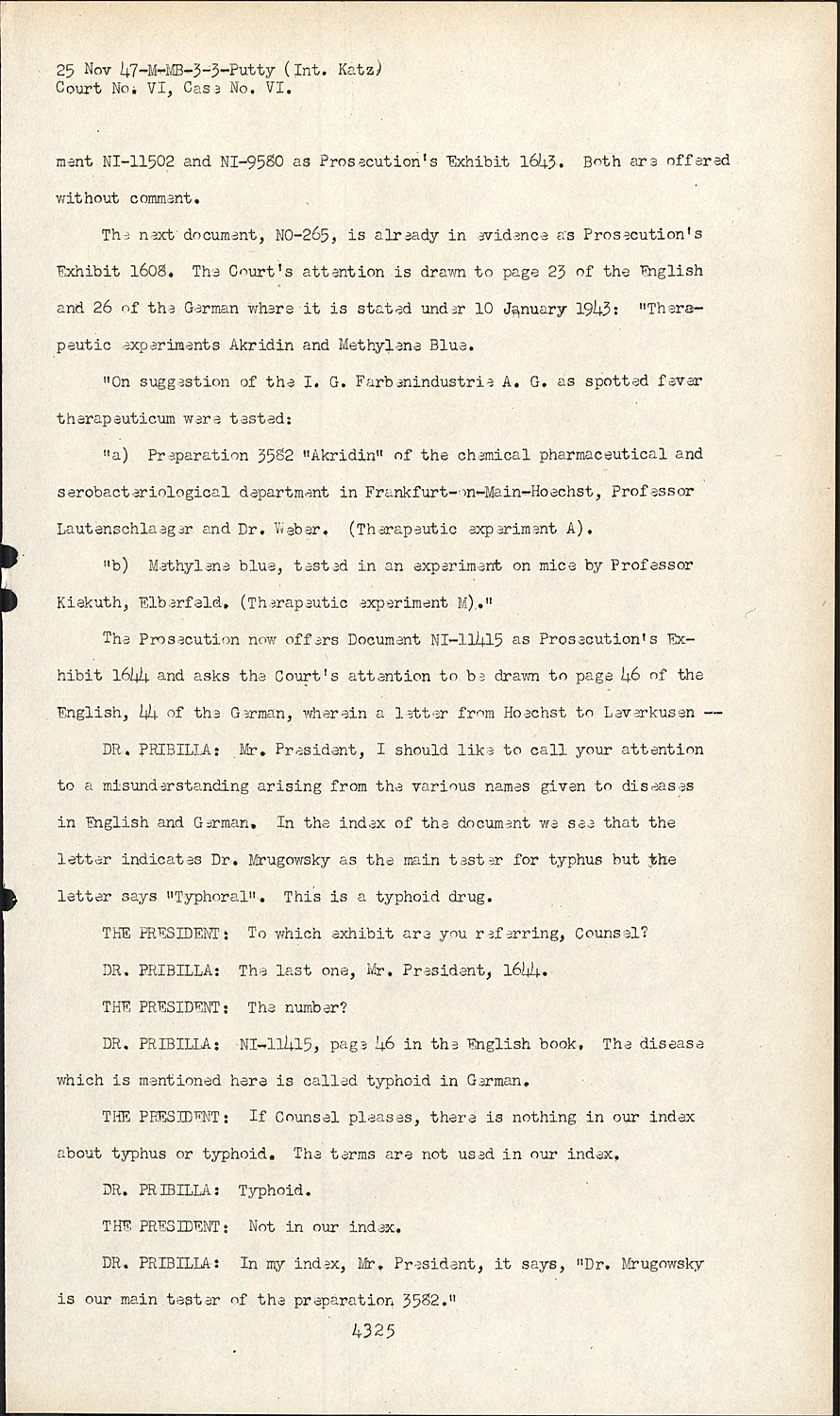 DR. PRIBILLA:Mr. President, I should like to call your attention to a misunderstanding arising from the various names given to diseases in English and German. In the index of the document we see that the letter indicates Dr. Mrugowsky as the main tester for typhus but the letter says "Typhoral". This is a typhoid drug.