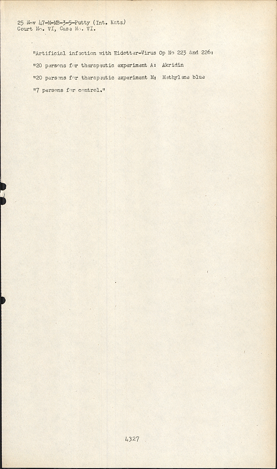 "20 persons for therapeutic experiment A: Akridin "20 persons for therapeutic experiment M: Methylene blue "7 persons for control."