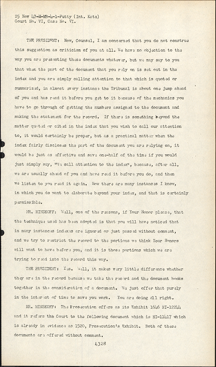 THE PRESIDENT:Now, Counsel, I am concerned that you do not construe this suggestion as criticism of you at all. We have no objection to the way you are presenting these documents whatever, but we may say to you that when the part of the document that you rely on is set out in the index and you are simply calling attention to that which is quoted or summarized, in almost every instance the Tribunal is about one jump ahead of you and has read it before you get to it because of the mechanics you have to go through of getting the numbers assigned to the document and making the statement for the record. If there is something beyond the matter quoted or cited in the index that you wish to call our attention to, it would certainly be proper, but as a practical matter when the index fairly discloses the part of the document you are relying on, it would be just as effective and save one-half of the time if you would just simply say, "We call attention to the index", because, after all, we are usually ahead of you and have read it before you do, and then we listen to you read it again. Now there are many instances I know, in which you do want to elaborate beyond your index, and that is certainly permissible.